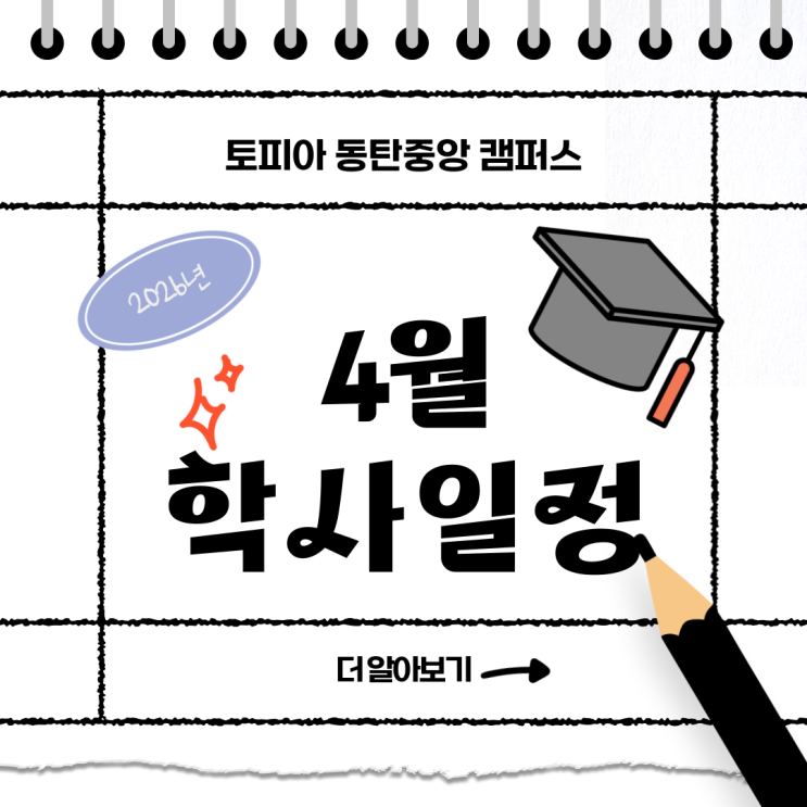 토피아 동탄중앙 캠퍼스 4월 학사일정을 안내드리니 참고하시어 학습에 차질 없도록 부탁드립니다. 봄학기 토피아 말하기대회 시상 4월 2~3일(목,금) 3월 26일(목) ~ 27일(금) 양일간 진행된 봄학기 토피아 말하기 대회가 성황리에 마무리되었습니다. 자신의 생각을 논리적으로 정리하고 대중 앞에서 당당하게 표현해낸 우리 모든 참가 학생들에게 아낌없는 박수와 격려를 보냅니다. 떨리는 마음을 뒤로하고 끝까지 최선을 다해 발표에 임한 모습이 매우 대견하고 자랑스러웠습니다. 대회에 참여한 학생들의 노력을 기리고 축하하기 위해 아래와 같이 시상식을 진행할 예정입니다. 중간고사 내신대비 토요보강 시작 4월 4일(토) 지난 3월 말부터....... <img src="https://blogthumb.pstatic.net/MjAyNjA0MDFfMTA4/MDAxNzc1MDQyMTYxMDI2.e0Y0ee0JyL6FVqarc2Di8NzUCoN7i7wAV8jWhThMGKQg.lUjA70bzeoxXnof05KSt6jenEFa2PNUigVZmKlolHUUg.PNG/4%BF%F9-%C7%D0%BB%E7%C0%CF%C1%A4-001_%281%29.png?type=s3" />