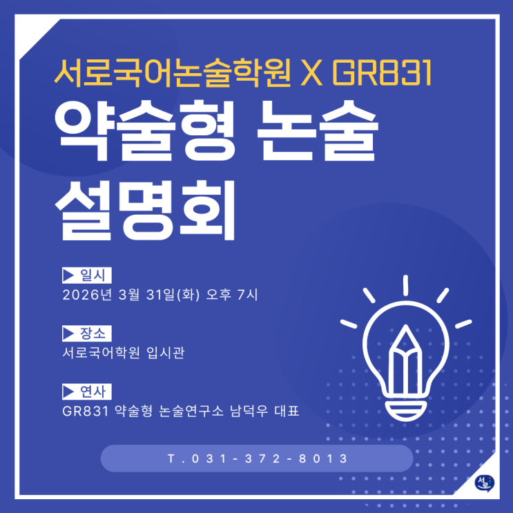 ■ 서로국어논술학원 X GR831 약술형 논술 설명회 후기 최근 입시에서 가장 주목받고 있는 전형 중 하나인 ‘약술형 논술 전형’ 내신 3등급~6등급 학생들에게 현실적인 기회가 될 수 있는 전형으로 떠오르면서 이번 설명회 역시 많은 관심 속에 진행되었습니다. ◆ “기회와 역전의 전형”이 현실이 되는 순간 이번 설명회는 단순한 정보 전달 자리가 아니었습니다. 내신 3등급~6등급 학생들이 실제로 어떻게 ‘합격’으로 뒤집는지, 그 과정을 막연한 가능성이 아니라 구체적인 구조로 보여주는 자리였습니다. 특히 가천대, 상명대, 을지대 등 최근 합격 사례들이 왜 계속 나오는지에 대해 단순 결과가 아닌 전형 구조 → 출제 의도 → 학습 방....... <img src="https://blogthumb.pstatic.net/MjAyNjA0MDFfMjc0/MDAxNzc1MDQ3ODg4NzI0.Qv51Q5jp_yborYbLkmhg5OCE7gQJ43i9SCbx60g6ir4g.ky39v9oQwJHZgJtF_Uj70EOV-wAPkNVL-Qsx8NVAWZkg.PNG/001.png?type=s3" />
