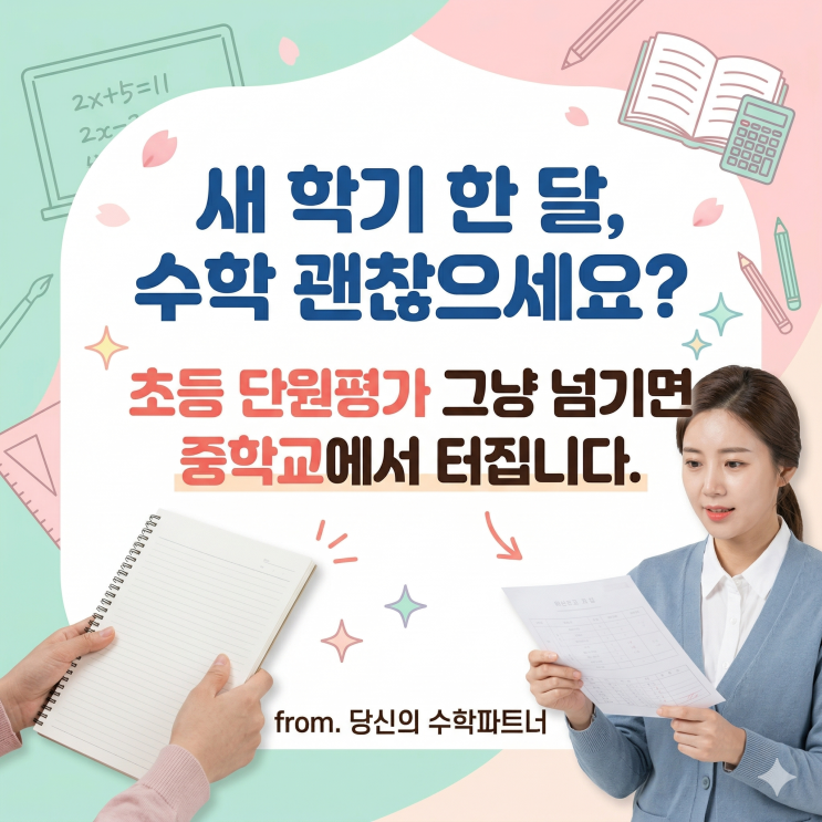 안녕하세요~ 수학파트너입니다. 벚꽃 소식이 들려오는 계절이 됐네요. 따뜻한 봄바람과 함께 새 학기도 어느새 한 달이 지나가고 있습니다. 아이들은 새 교실, 새 선생님, 새 친구들에 적응하느라 바쁘고 학부모님들은 또 그런 아이를 바라보며 이런저런 걱정이 쌓이는 시기이기도 하죠. "이번 학기는 수학 좀 제대로 잡아야 할 텐데…" 슬슬 그런 마음이 드신다면, 오늘 글이 딱 맞습니다. "초등 수학 단원평가쯤이야" 하고 넘기셨다면, 지금 멈춰주세요. 그 한 번의 방치가 중학교 1학년 수학에서 고스란히 터집니다. 오늘은 단원평가가 왜 중등 수학의 기초인지, 그리고 지금 어떻게 잡아야 하는지 정확히 짚어드릴....... <img src="https://blogthumb.pstatic.net/MjAyNjAzMjhfMjk2/MDAxNzc0NjcxNjAzODE4.w7zJX75ceFTEywae0YecgpYL7q_5EswfSUMf-yvPRaAg.wkrcGCEJ9wVGTOX-osTXiggN2EOFbhZKhaoYH09FDTUg.PNG/Gemini_Generated_Image_27xtke27xtke27xt.png?type=s3" />