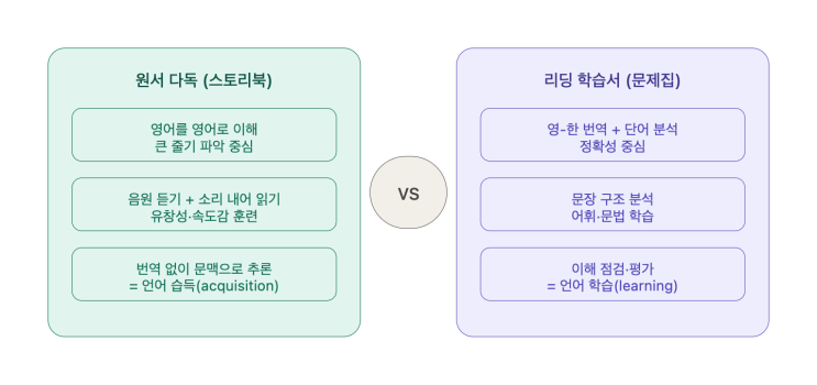 안녕하세요, 유니스입니다. 상담을 하다 보면 학부모님들께서 자주 물어보시는 것이 있어요. "원서 읽을 때 모르는 단어나 문장을 일일이 한국어로 번역해줘야 하나요?" 결론부터 말씀드리면, 꼭 그렇게 하지 않으셔도 됩니다. 오히려 매번 번역해주는 것이 장기적으로 영어 실력 향상에 방해가 될 수 있어요. 왜 그런지, 언어 습득 이론과 함께 설명해 드릴게요. 언어 '습득'과 언어 '학습'은 다릅니다 언어학자 스티븐 크라센(Stephen Krashen)은 제2언어 발달을 설명하는 이론에서 습득(acquisition) 과 학습(learning) 을 명확히 구분했습니다. 습득: 의미에 집중하면서 자연스럽게 언어가 내면화되는 과정 →....... <img src="https://blogthumb.pstatic.net/MjAyNjAzMjlfMTUz/MDAxNzc0NzcyMzAwMzE1.ddmK6dCjO5-L8owzQfGLwlBU_xN0fYdU7lQBaeT3JD0g.yTzIvLVVoTOPAvAlY8AOTKGA_YlgQWtm6AcQOD2FD7wg.PNG/image.png?type=s3" />