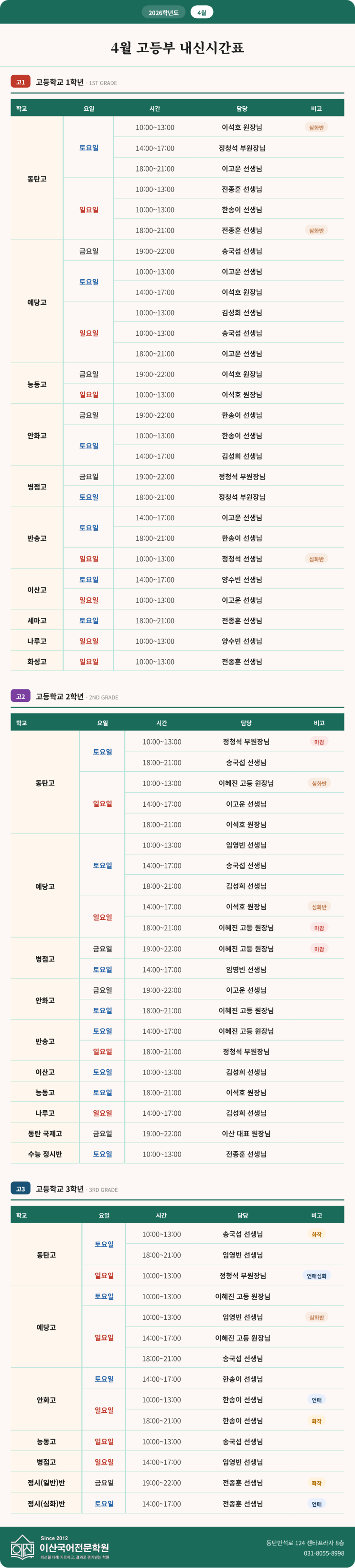 이산국어 고등부 4월 내신시간표_이산국어 전문학원