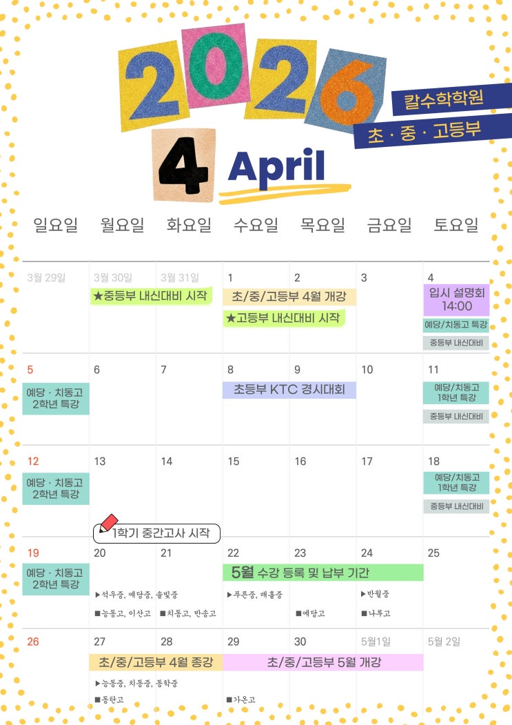 칼수학학원 전체 필독! 동탄 칼수학 2026년 4월 일정 안녕하세요. 1동탄 반송동 북광장 수학학원 칼수학입니다. 어느덧 차가운 겨울바람은 물러가고, 따스한 봄 햇살과 함께 4월이 찾아왔습니다. 학기 초의 긴장감도 잠시, 이제는 학교와 학원 생활에 제법 익숙해진 아이들의 웃음소리가 더욱 건강하게 들리는 요즘입니다. 4월을 맞아 학부모님들께 따뜻한 안부 인사를 전합니다. 늘 건강과 행복이 가득하시길 기원합니다! ----초/중/고등 전체 해당---- 동탄 중/고등학교 각 학교별 1학기 중간고사 일정 안내 [중학교2~3학년] 석우중 4월 21일 ~ 22일 예당중 4월 21일 ~ 22일 솔빛중 4월 21일 ~ 22일 푸른중 4월 22일 ~ 23일 매홀중 4월 22일....... <img src="https://blogthumb.pstatic.net/MjAyNjAzMzBfODYg/MDAxNzc0ODUxNzY0NTM2.UzUFGSHJIt9W3_rCJR5hTqdSKG_o-B-ze9OkWl4LDZcg.qHCxEcCNhYG7JEeS0DqAGeFj0hkqknzPEeLZWRgFFpUg.JPEG/%C1%A6%B8%F1%C0%BB_%C0%D4%B7%C2%C7%D8%C1%D6%BC%BC%BF%E4._%2871%29.jpg?type=s3" />