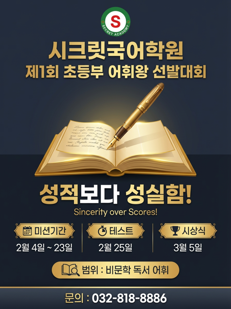 안녕하세요! 인천 연수구 동춘동 국어학원에서 아이들의 기초 학력과 사고력을 튼튼하게 다져나가는 시크릿국어학원입니다. 최근 교육계의 화두는 단언 '문해력'입니다. 글을 읽어도 무슨 뜻인지 몰라 수학 문장제 문제를 못 풀거나 사회, 과학 개념 이해에 어려움을 겪는 아이들이 많아지고 있습니다. 문해력의 가장 밑바탕이자 핵심인 기초체력, 그것은 바로 **'어휘력'**입니다. 우리 아이들의 어휘 자신감을 높여주고 즐거운 학습 동기를 부여하기 위해, 저희 학원에서 아주 특별한 이벤트를 준비했습니다! 제1회 초등부 '어휘 왕 선발대회' 단순히 단어를 외우는 것을 넘어, 문맥 속에서 의미를 파악하고 정....... <img src="https://blogthumb.pstatic.net/MjAyNjAyMTFfNDIg/MDAxNzcwNzg4MzM1MDM5.nt6vk9qBiaFw_LpDLtBUA_PRRefkifAJ4P1aWCqnVNEg.KZ3ER8J_SLbtIOVgngh6A9BBoozFGJBIxeliVp4RUTMg.PNG/%B1%B9%BE%EE-3.png?type=s3" />