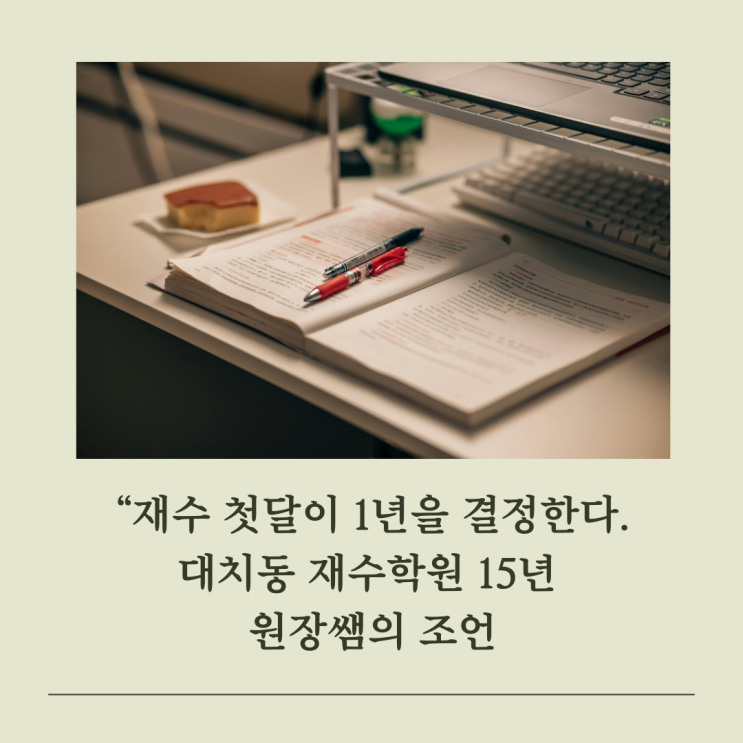 재수, 첫 달이 1년을 결정한다 1월 셋째 주, 학원 상담실 문을 열고 들어온 어머니의 표정이 무거웠다. "선생님, 우리 애가 3월부터 시작하면 안 될까요? 아직 마음 정리가 안 됐대요." 나는 조심스럽게 물었다. "지금이 1월 말인데, 왜 3월까지 기다리시려고요?" "다른 애들도 3월에 많이 시작한다던데요. 2월은 아직 방학 분위기잖아요." 15년간 수천 명의 재수생을 지켜본 나는 안다. 이 한 달의 차이가 11월 수능 결과를 바꾼다는 것을. 100미터 뒤처진 마라톤 재수는 42.195km 마라톤이다. 출발선에서 100미터 뒤에 서면 어떻게 될까. 앞선 주자들을 따라잡으려 무리하다가 20km 지점에서 무릎이 나간다. 3월....... <img src="https://blogthumb.pstatic.net/MjAyNjAxMjZfODIg/MDAxNzY5NDI5MTkwNzA5.69DGaKhG0PcxatAo523MBdfkhb17Yi49Bhvp3aUaDOIg.UiCQGkOROf8axAfWKj-jWCuycaB6urKWblc8AWtUQ-Ag.PNG/%26ldquo%3B%C3%B9_%B9%AE%C0%E5%C0%CC_%BE%C8_%BD%E1%C1%FA_%B6%A7_%BF%A1%BC%BC%C0%CC_%BD%C3%C0%DB%C7%CF%B4%C2_3%B0%A1%C1%F6_%B9%E6%B9%FD.%26rdquo%3B_%281%29.png?type=s3" />