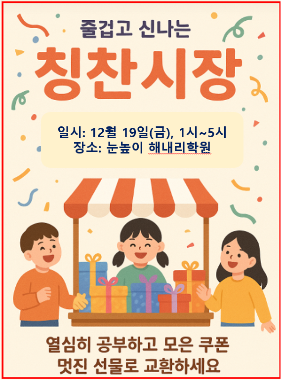 12월 19일, 드디어 우리 친구들이 기다리던 칭찬시장이 열립니다! 한 학기 동안 열심히 모은 칭찬쿠폰, 이 날 마음껏 사용할 수 있어요! 아이들이 모은 쿠폰으로 장난감, 문구류, 간식 등 다양한 상품을 GET! 우리 친구들 기대해도 좋아요 12월은 한 학기를 정리하고, 다음 학년을 준비하는 가장 중요한 시기! 칭찬시장과 쿠폰 이벤트로 아이들이 즐겁게, 의욕적으로, 성장하며 겨울방학을 맞이할 수 있도록 도와드릴게요 궁금한 점은 언제든 센터로 문의 주세요! 우리 아이들의 성장을 응원합니다 ✨ <img src="https://blogthumb.pstatic.net/MjAyNTEyMDdfMjE2/MDAxNzY1MDkzMDkwMDEy.a8jeb07AvcbGd4bWpKFQXO-8nh9h2c0NlTv21pyCF0gg.DinFVLf8_jlk507ZcUCDcLX4CTVQPkpNh4-ULj148LEg.PNG/1764570439806.png?type=s3" />