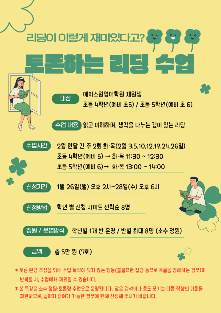 [자양동 영어학원] 초등 4학년(예비 5학년) 대상 2월 리딩 특강: 토론하는 리딩 수업 안내