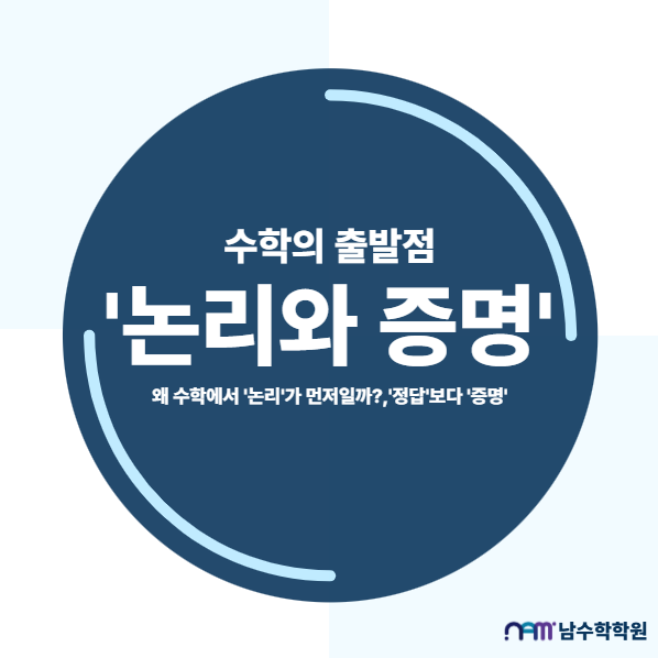 안녕하세요, 남수학학원입니다. 왜 수학에서 '논리'가 먼저일까? 많은 학생들은 수학을 '계산을 잘하면 되는 과목'이라고 생각합니다. 하지만 수학을 학문적으로 바라보면, 수학은 계산의 학문이 아니라 논리의 학문입니다. 실제로 수학의 모든 이론은 정의, 가정, 논리적 추론, 증명 이라는 구조 위에 세워져 있습니다. 중고등학교 수학에서 자주 등장하지만 제대로 다뤄지지 않는 논리와 증명, 진짜 수학 실력을 결정짓는 핵심, 자세히 알아볼게요. '정답'보다 '증명' 수학 문제를 풀 때 정답만 맞히면 된다고 생각하기 쉽습니다. 하지만 수학자에게 정답은 중요하지 않죠. 수학에서 가장 중요한 것은....... <img src="https://blogthumb.pstatic.net/MjAyNjAxMDdfNjcg/MDAxNzY3Nzg0MjgxMjEy.r9EhzNgPbVojwt26GTyxGh0sJPXQ1ri1kV4cQazJwPcg.mWlwBXHvdBtWrjlhJIEhaOxO5DB-mNILarc29RsrNh0g.PNG/1.PNG?type=s3" />