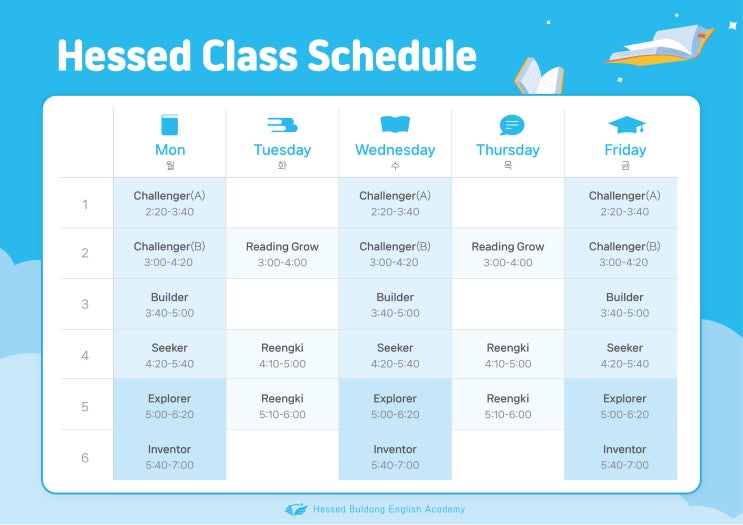 헤세드 3월 시간표 변경 안내 안녕하세요, 헤세드불당어학원 학부모님, 학생 여러분! 따뜻한 봄이 성큼 다가오는 3월을 맞아, 새학기 시작과 함께 수업 시간표가 새롭게 변경되었습니다. 3월 수업 안내 초등 영어 월,수,금 (주 3회) Challenger(A) 영어 기본반 1 / 2:20~ Challenger(B) 영어 기본반 2 / 3:00~ Builder 영어 기본반 3 / 3:40~ Seeker 파닉스 기초반 / 4:20~ Explorer 영어 심화반 1 / 5:00~ Inventor 영어 심화반 2 / 5:40~ 유치부 영어 화,목 (주2회) Reengki 5~7세 영어 기초반1 / 4:10~ Reengki 5~7세 영어 기초반2 / 5:10~ 변경된 시간표에 대해 궁금한 점이 있으시거나, 우리 아이에게 맞는 반을 찾고 싶으신 분은....... <img src="https://blogthumb.pstatic.net/MjAyNjAzMTFfNyAg/MDAxNzczMjEyNzE3MzM5.U51b_mUNEcrXYva3LF5dDvI17IReMeMXfiFxe9gp47Mg.S8uYX-pSrQp8ADoReSCy2p1faJWBkIIpv9jbbbZXIMog.JPEG/KakaoTalk_20260311_145802719.jpg?type=s3" />