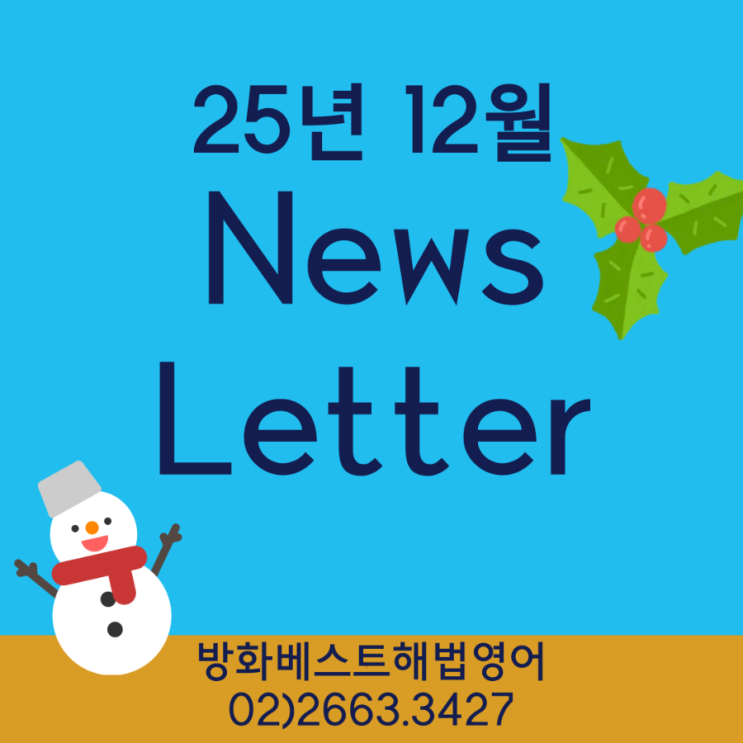 안녕하세요. 기초탄탄 구멍없는 영어학습을 지향하는 방화베스트해법영어입니다. 12월 뉴스레터입니다. 1.초등 할로윈 스페셜 수업 할로윈의 캐릭터 등을 게임으로 알아보고 영어신문 기사와 스토리를 통해 의미와 풍습을 알아보는 시간이었어요. 모두 즐겁게 수업했습니다. 2.중등 중간고사 마무리 기말고사 준비 중간고사를 잘 마무리했습니다. 인근 방화중 3학년 시험은 역대 최고 난이도로 제일 높은 반의 평균이 50점대였습니다. 우리 학원에서는 지필고사와 수행 합산 99.5점으로 전교 2등 이 나왔습니다. 중간고사가 끝나자 바로 기말고사 준비에 들어갔어요. 중간고사와 기말고사의 간격이 짧아 숙제가 많으니 학부모님의 많은 관심 부탁....... <img src="https://blogthumb.pstatic.net/MjAyNTExMjdfMTY3/MDAxNzY0MjI4ODM0MDQw.kn8xdSROBqEP3qWkZCSVl4WkqBqatq6UMJER2gG5PxIg.6segMio3C2dCos9YXQ9fpKsryZ0Tvi4pWTBV5nqVqUAg.PNG/900%A3%DF1764126902765.png?type=s3" />