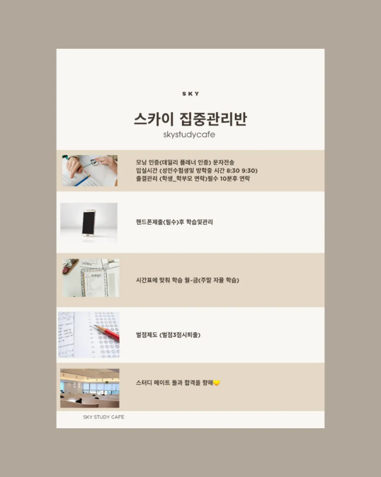 사계절의 마지막 곧 겨울방학 입니다. 겨울방학동안 어떻게 보낼까 고민하고 있다면 ᆢ 이번에 진짜 공부 습관을 바꿔보세요!! 혼자 공부가안되요 앉아있어도 다른생각만 해요 이런생각 해본적 있으시죠? 스터디카페 와서도 핸드폰만 보다가 딴짓거리만 하다가 시간만 보내는 분들 이젠 달라져야 할때 입니다 스카이 집중관리반에서는 공부 루틴을 만들어 드립니다. 집중 관리반 이란 스카이는 습관을 설계하고 목표를 달성하는 관리형 집중관리반을 운영합니다 ✔️출석 퇴실관리 매일 출석 관리로 루틴형성 ✔️공부시간기록 개인공부시간통계 ✔️핸드폰보관 산만함차단 의지강화 ✔️목표설정 단순공부가아닌 성과관리 중심 이런분들께 추천....... <img src="https://blogthumb.pstatic.net/MjAyNTEyMDFfMjg4/MDAxNzY0NjAwMTMzMzkz.mIXmyHbqA2j8pzzEPLvFP-s4FbCwbOLs6Ey4bL0gPSkg.t6jBu-4UCBxaJrk-UDrSzNobuCIDXsAR0actNDDm2HAg.PNG/900%A3%DF20251201%A3%DF232156%A3%DF0000.png?type=s3" />