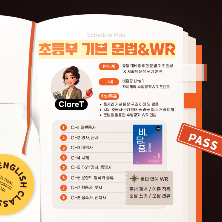 초등부 기본 문법 & WR “기본기 완성 전문가! Clare 선생님과 함께 중등 대비를 시작하세요!” 안녕하세요, 프라미스 학부모님 초등 고학년부터 반드시 잡아야 하는 문법 기초 + 서술형 쓰기(Writing). 이 두 가지를 한 번에 완성하는 초등부 기본 문법 & WR 클래스를 소개합니다! 반 소개 “중등 영어, 기본기에서 승부가 납니다!” Clare 선생님의 수업은 ✔ 초등 수준에 꼭 맞춘 기초 문법 ✔ 중등 대비 핵심 문장 구조 ✔ 서술형 쓰기 기본기 잡기 이 세 가지를 완벽히 균형 맞춰 진행합니다. 중등 입학 전 반드시 필요한 품사·문장 구조·시제·조동사·기본 문장 패턴을 탄탄히 익히고, 이 개념을 실제로 문장에 적용....... <img src="https://blogthumb.pstatic.net/MjAyNTEyMDVfMjk3/MDAxNzY0OTM3NzUzMjI5.INbLM2klRv72EMMtF9mkny3oa8W-qZmCDIGYMB9Ph0Mg.iMBBVEMU3NeFop-Jg0SjBEcN0fbXO5Qxu5JlCOXrDfwg.PNG/4.png?type=s3" />