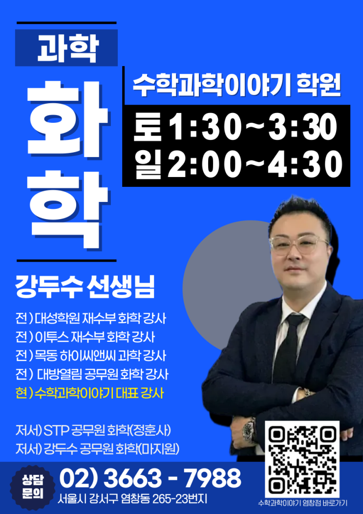 염창동 과학·화학 전문! 강두수 선생님 화학반 오픈 안내 안녕하세요! 염창동에서 과학·화학 전문 수업을 찾고 계신다면, 오늘 소개해드릴 수학과학이야기 학원 염창점의 강두수 선생님 화학 수업을 주목해 주세요. 탄탄한 경력과 열정적인 강의 스타일로 이미 많은 학생들에게 신뢰를 받고 있는 강두수 선생님이 드디어 염창에서 직접 강의를 진행합니다! 강두수 선생님은 어떤 분인가요? 강두수 선생님은 여러 교육기관에서 두터운 경험을 쌓아온 화학·과학 전문 강사입니다. 주요 경력 전) 대성학원 재수부 화학 강사 전) 이투스 재수부 화학 강사 전) 목동 하이씨앤씨 과학 강사 전) 대방열림 공무원 화학 강사 현) 수학과학....... <img src="https://blogthumb.pstatic.net/MjAyNTEyMDhfMTQ0/MDAxNzY1MTc4NjI3NDE3.haCmQ35W4zaYqdFEc9aiH2Ji-F24lXbtih_z1j7Ny8Mg.vtraX8N5HcgNAF-BLYydT5LmZyusDGHUu-kKdLbv4gIg.PNG/%BE%C6%C6%C4%C6%AE-%C0%FC%B4%DC%BD%C3%BE%C8-01-004_%282%29.png?type=s3" />