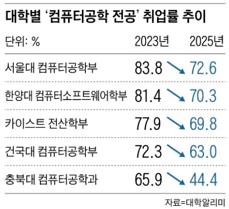 현재 미국에서 처럼 대한민국 입시와 취업 시장에서도 **'컴퓨터공학과의 위기와 변화'**가 오고 있다. 불과 몇 년 전까지 '취업 치트키'로 불리던 컴공이 왜 이런 상황을 맞이했는지, 그리고 앞으로 현재 고등학생들이 어떻게 대비해야 하는지 핵심만 짚어 정리해 본다. 1. 숫자로 보는 현실 한때 "문과라서 죄송합니다(문송합니다)"라는 말이 유행이었다면, 이제는 "컴공이라서 죄송합니다"라는 말이 나올 정도로 상황이 급변했다. 취업률의 급격한 하락: 서울대(83% → 72%), 카이스트(77% → 69%) 등 우리나라 최고의 대학들조차 취업률이 10%p 가까이 떨어졌다. 신입 채용문의 축소: 기업들이....... <img src="https://blogthumb.pstatic.net/MjAyNjAyMjFfNDkg/MDAxNzcxNjY3MDQ5MTM3._I3egbdyv0_WL6r0W5Q_asqBsHSxDbwCRMMxSl23qwYg.U666nNqj_bNEljw8Kx0rwFcpclTydSOkH_LagsbcFE0g.JPEG/%C8%AD%B8%E9_%C4%B8%C3%B3_2026-02-05_205951.jpg?type=s3" />