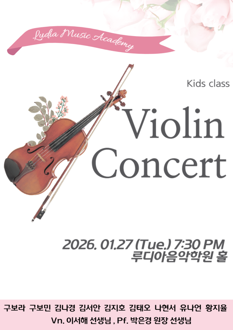안녕하세요, 루디아음악학원 관악점입니다 지난 1월 27일 화요일, 루디아 kid class에서 바이올린 발표회가 있었습니다! 매일 연습만 하다 보면... 어느 순간 마음이 조금 느슨해질 때도 있잖아요... 다들 공감하시죠?! 그래서 저희는! 많은 사람들 앞에서 연주해보는 짜릿한 경험과 한 곡을 끝까지! 완주해보는 성취감을 느낄 수 있도록 작은 연주회를 주기적으로 열고 있답니다 유치부 6세 친구부터 초등학교 6학년 친구들까지, 그동안 차곡차곡 쌓아온 연습의 시간을 작은 무대 위에서 꺼내 보이는 날이었어요! 아이들 각자가 지금까지 배운 곡을 스스로의 힘으로 끝까지 연주해보는 시간, 그 자체로도 충분히 의미 있는 순간이었어....... <img src="https://blogthumb.pstatic.net/MjAyNjAyMDJfNjgg/MDAxNzY5OTU4MDA4NzI2.gfZjS1fkM6rizPDc9V9EUFWhU8ZUVgHG-w5u0_dfiSAg.DdaDK4vBrF-r9ZrWRFn_JZ6Wcu5QLwS7JBHOLPyaW7cg.PNG/KakaoTalk_Photo_2026-02-01-23-57-35.png?type=s3" />