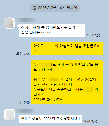 스승은 가르치며 배우고, 제자는 배우며 성장한다. 교학상장(敎學相長)''이라는 말이 있어요. 8년 동안 한자리에서 아이들을 가르쳤는데 오늘 아침만큼은 저의 제자가 저의 스승이 되어 '진심을 전하는 법'을 가르쳐 주었습니다. 학부모님들~!!! 바쁘면서 또 즐거운 설 연휴 보내고 계시나요? ^^ 저 오늘 아침에 정말... 너무너무 행복하고 감동적인 선물을 받아서 자랑하러 달려왔어요! 글쎄, 이제 막 중학생이 되는 우리 예쁜 제자에게서 "선생님 새해 복 많이 받으시고 즐거운 설날 되세요 ⪩. .⪨ "라는 카톡이 온 거 있죠? 세상에... 세상에...세상에... 어쩜~ 이렇게 기특하고 예쁠까요? ㅠㅠ 8년 학원 인생....... <img src="https://blogthumb.pstatic.net/MjAyNjAyMTZfMTQx/MDAxNzcxMjAxNTkwMDc5.RETOCoo0aKFgpoJDTX5PAXAAe0mvy7s84gIB6kKyQ2og.UBMWBXQ49m_Pl5uSBkT8h7iuvPNJDW_VQC3q2lRhYOkg.PNG/image.png?type=s3" />