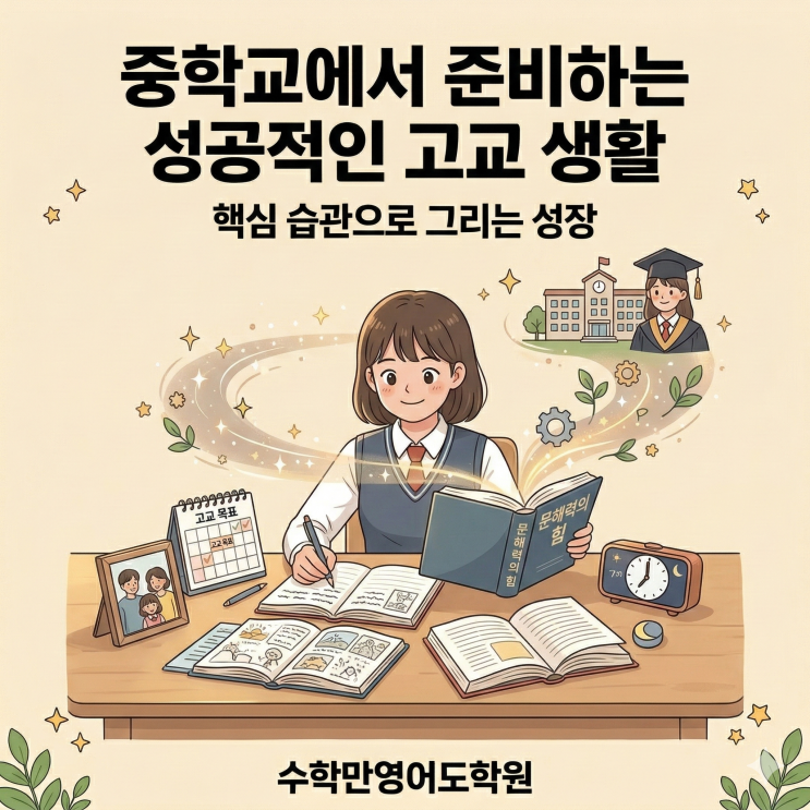 안녕하세요! 수학만영어도학원입니다. 중학교 시기는 초등 과정을 벗어나 실질적인 고등 과정의 기초를 닦는 매우 중요한 시기입니다. 아는 만큼 보이고 준비할 수 있듯이, 중학교 과정은 고등학교 과정의 예행연습이라 할 수 있습니다. 고등학교 진학 후 겪을 수 있는 어려움을 예방하고 원하는 결과를 얻기 위해서는 중학교 때부터 탄탄한 습관을 만들어야 합니다. 오늘은 대입 성공의 든든한 토대가 되어줄 '중학생 시기에 길러야 할 5가지 습관'에 대해 알아보겠습니다. 1. 다이어리 작성 습관 중학교 때부터 학교 수업 중에 있었던 일들을 꼼꼼히 기록하는 습관이 꼭 필요합니다. 고등학교 학생부의 핵심인 '세특(세부....... <img src="https://blogthumb.pstatic.net/MjAyNjAzMDdfMjU1/MDAxNzcyODU4NTE5MjI5.EPphmP8Y4yjmmc0-BYBcdojw5eeh6uDn_BR-pw1Ignwg.8_1Z1XIQEGhIxhQRrcKdf6RmIn3e6oyUmL2RYDTPGugg.PNG/Gemini_Generated_Image_1mgcsf1mgcsf1mgc.png?type=s3" />