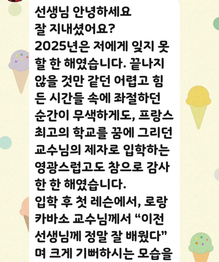 새해를 맞아 프랑스 리옹에서 유학 중인 제자로부터의 안부 인사입니다. 어릴 때부터 함께 음악을 공부하며 시간을 쌓아 온 아이인데, 매년 잊지 않고 먼저 연락을 주는 마음이 참 고맙습니다. 연습실에서 보냈던 수많은 시간들, 잘 되지 않아 속상해하던 순간들, 그리고 조금씩 성장해 가던 과정들이 자연스럽게 떠오릅니다. 그 시간들이 지금의 이 아이를 만들었겠지만, 동시에 저에게도 선생으로서 많은 배움을 남겨주었습니다. 유학 생활은 결코 쉽지 않은 길일 것입니다. 그럼에도 자신의 자리에서 묵묵히 음악을 이어가고 있다는 소식만으로도, 선생으로서는 충분히 감사한 마음이 듭니다. 요즘 들어 어린 시절 함께 연습하던 시간들이 자....... <img src="https://blogthumb.pstatic.net/MjAyNjAxMDRfNTYg/MDAxNzY3NTMxNzcxNDgw.2C4wNn2T5F33TO9nXU2wZK1B4boA4D1Cd9qpQ7VpMR4g.Sys0YV3gy-2wU9EBPb0VK749SM5oqMNfE1b7Pe6K88Yg.JPEG/IMG%A3%DF8768.jpg?type=s3" />