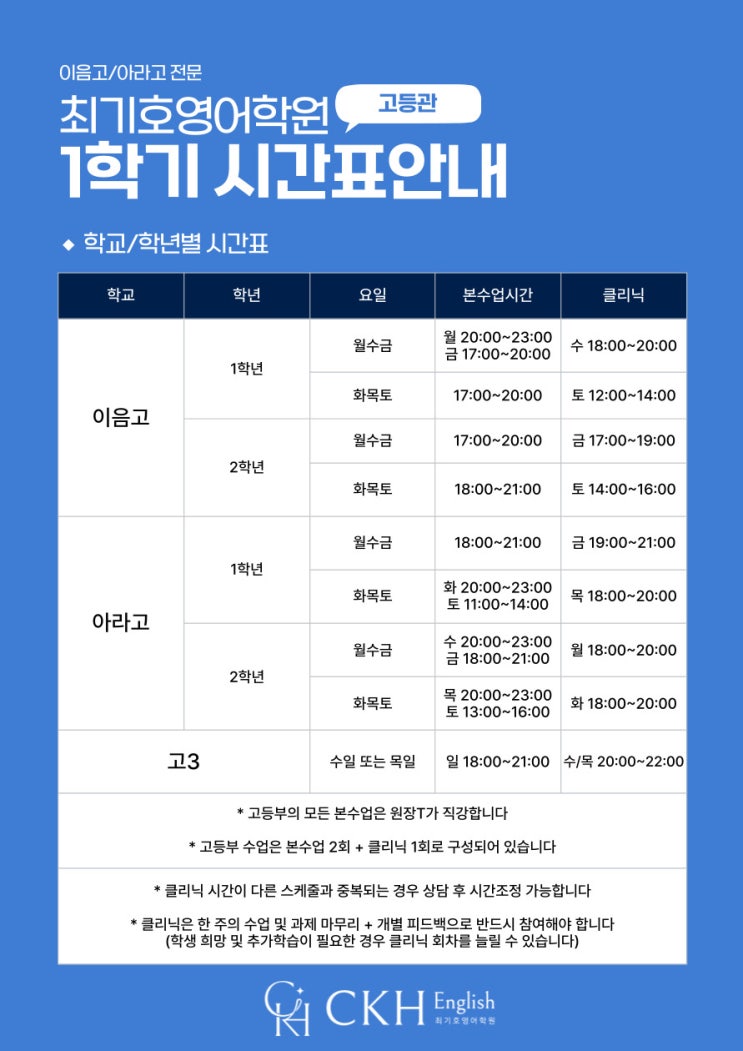 안녕하세요 최기호영어학원입니다. 3월 개강과 함께 진행되는 각 학교별 내신대비 시간표 공유드립니다 이음고1 월수금반 본수업 : 월금 클리닉 : 수 이음고1 화목토반 본수업 : 화목 클리닉 : 토 이음고2 월수금반 본수업 : 월수 클리닉 : 금 이음고2 화목토반 본수업 : 화목 클리닉 : 토 아라고1 월수금반 본수업 : 월수 클리닉 : 금 아라고1 화목토반 본수업 : 화토 클리닉 : 목 아라고2 월수금반 본수업 : 수금 클리닉 : 월 아라고2 화목토반 본수업 : 목토 클리닉 : 화 요일별 시간은 위의 표를 참고해 주시기 바랍니다 저희 예비고1/2학년 학생들 모두 겨울방학동안 문법 본교재 1권 + 추가문제풀이 + 모의고사 16회분 + a 의 모든 학습을....... <img src="https://blogthumb.pstatic.net/MjAyNjAyMjdfNjYg/MDAxNzcyMTg3NzAyNzU1.Rnh73G7txGwEYXaM1g3RKpWjkZYpuHGNpVx7Z3xZstgg.RyCAvqI-_5OMuGX8-d2xfqzqTDteUkSwsUoZz47B3OIg.JPEG/26%B3%E2%B0%ED%B5%EE%BD%C3%B0%A3%C7%A5-001.jpg?type=s3" />