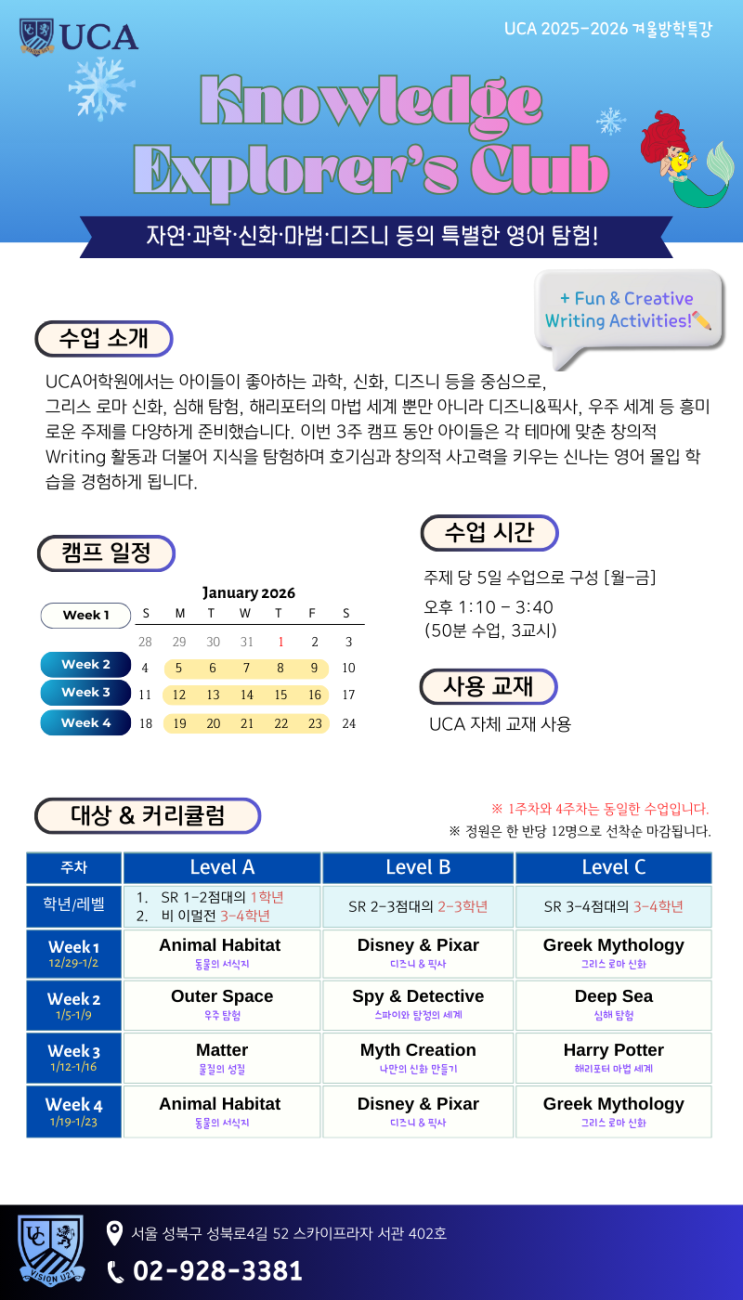 안녕하세요. UCA어학원입니다! 이번 겨울캠프 오후에 진행하는 Knowledge Explorer’s Club를 소개합니다. ✨ 저희 Knowledge Explorer’s Club는 과학·역사·신화·자연·사회 등 일주일에 한 가지의 테마로 영어로 탐구하는 융합형 영어 몰입 프로젝트 수업입니다. 스파이, 디즈니, 그리스·로마 신화, 해리포터, 심해 탐험 등 아이들이 좋아하는 다양한 주제를 바탕으로 읽기·어휘·말하기·미션·프로젝트 활동을 영어로 자연스럽게 연결하여 배우는 수업입니다. ✨ Knowledge Explorer’s Club 수업 구성 ✅ 다양한 Nonfiction & Theme Text 읽기 ✅ 핵심 어휘 & 배경지식 학습 ✅ 주제 기반 Speaking & Discussion ✅ 문....... <img src="https://blogthumb.pstatic.net/MjAyNTEyMDJfMjAz/MDAxNzY0NjY0NjI2MTcw.5jzWmdy8Lk9qopbIdrev-cSZL2pQIFM7CZVZ6kaNrR0g.h872Le53t6fDyIoJ0SYcv9MdUVHn6tV6oeElOH3P7dYg.PNG/Winter_Knowledge_Explorer%27s_Club_%28800_x_1400_px%29_%281%29.png?type=s3" />