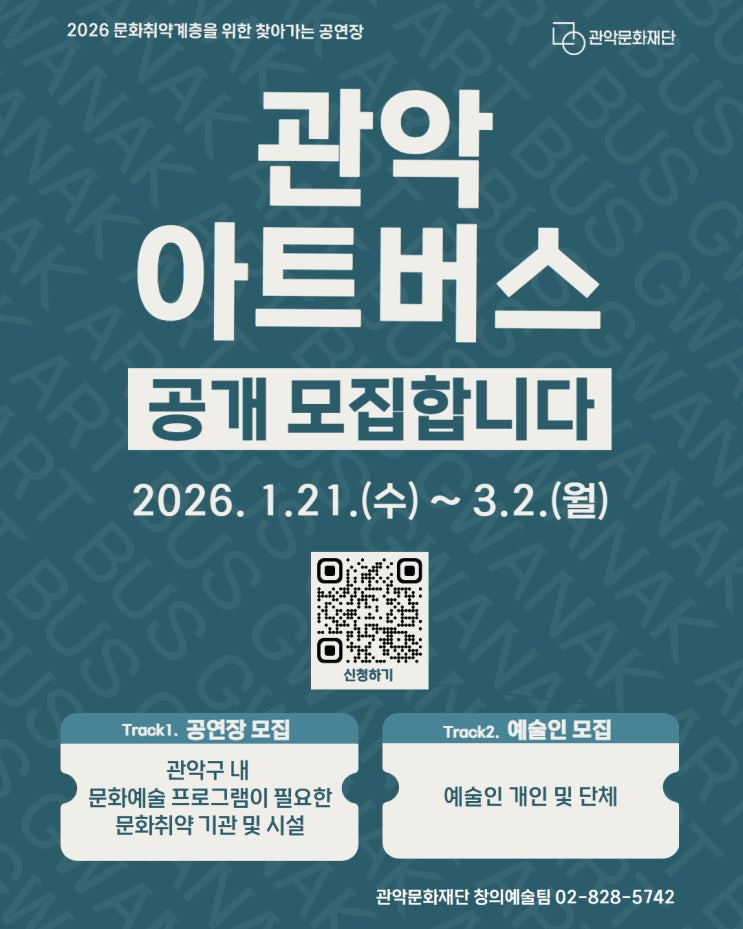 2026 문화취약계층을 위한 찾아가는 공연장 <관악아트버스> 공개 모집 / 접수기간 : 2026.01.21(수) ~ 2026.03.02(월)