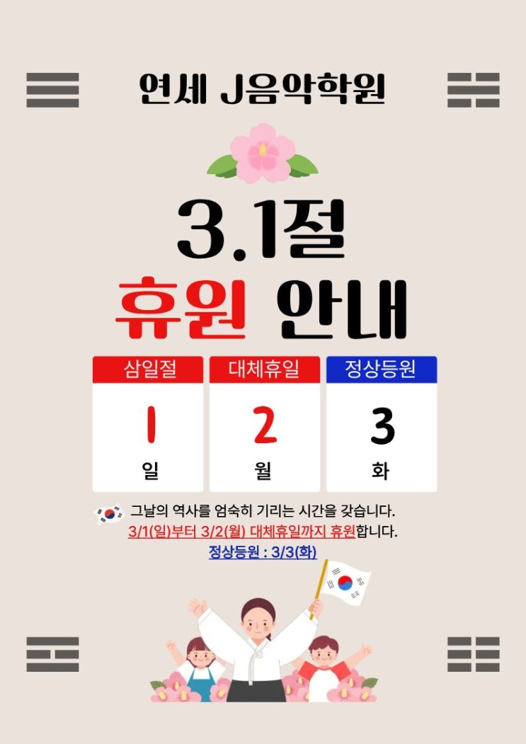 연세 J음악학원 3.1절 휴원 안내 봄의 시작과 함께, 순국선열의 숭고한 희생과 나라 사랑의 의미를 되새기는 시간입니다 3월 1일(일)부터 3월 2일(월) 대체휴일까지 휴원. 3월 3일(화)부터 정상등원입니다. 가정에도 따뜻하고 뜻깊은 시간이 되시길 바랍니다. 감사합니다 연세 J음악학원 010-7358-4216 ⬆️⬆️⬆️⬆️⬆️⬆️⬆️ 교육상담은 수업중에는 어려우니 위의 학원번호나 아래 카카오톡 채팅으로 문의주세요 https://open.kakao.com/me/yonsei_j_music #연세J음악학원 #yonsei_j_musicacademy #신원동피아노음악학원 #꿈나라유치....... <img src="https://blogthumb.pstatic.net/MjAyNjAyMjdfOTkg/MDAxNzcyMTcwNTcyNDk0.iekmc4PN54I9nPUBj0X11h0qZVUtq2TIbIfwM9aJn1Eg.q-Xo0y430CTBOAI8B6hw4eDu2oAzyiS0KXem92LB7gIg.JPEG/1772170039346.jpg?type=s3" />