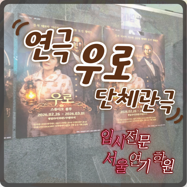 안녕하세요. #일산연기학원 #서울연기학원 #파주연기학원 #김포연기학원 #입시전문서울연기학원 #서울연기학원추천 #문산연기학원 #금촌연기학원 #야당연기학원 운정연기학원 #대화연기학원 #주엽연기학원 #정발산연기학원 #고양연기학원 #마두연기학원 #백석연기학원 #원흥연기학원 #화정연기학원 #홍대연기학원 #신촌연기학원 #사당연기학원 #목동연기학원 #신사연기학원 #강남연기학원 #사당연기학원 #잠실연기학원 #예고입시연기 #뮤지컬입시 #입시연기학원 #연기학원 과 관련된 입시경력 26년차의 대표 직강만으로 입시반 메인 특기수업을 1:1레슨으로 매주 1시간씩 운영하는 입시전문서울연기학원입니다. 오늘은 #연극 #우로 #단체관극 소....... <img src="https://blogthumb.pstatic.net/MjAyNjAzMDRfMjk3/MDAxNzcyNjE4NjUxMjg4.M_doW7AipcaQd8hG0duZ9QpKefIQ-1nVAF_7vn1zf14g.fwyepiR0SX8Vs5iVp1QDCO7OlQT02KI7gl41zMB3Hjsg.PNG/%C1%A6%B8%F1%C0%BB-%C0%D4%B7%C2%C7%D8%C1%D6%BC%BC%BF%E4_-001_%288%29.png?type=s3" />