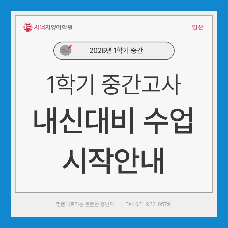 안녕하세요, 시너지영어학원 일산관입니다. 새 학기의 첫 단추를 결정짓 2026년 1학기 중간고사 대비를 본격적으로 시작합니다 방대한 시험 범위와 까다로운 외부 지문, 혼자 고민하지 말고 시너지와 함께 전략적으로 준비하세요. 시너지의 빈틈없는 중간고사 대비 과정 ✅ 변형문제 완벽 대비 단순 암기는 NO! 모든 예상 문제 유형을 철저히 분석하여 정복합니다. ✅ 외부지문 정밀 분석 처음 보는 생소한 지문도 당황하지 않도록 완벽하게 분석해 수업합니다. ✅ 핵심 압축 정리 시험 공부는 효율적으로 방대한 범위를 시험에 나올 핵심 포인트만 쏙쏙 골라 정리합니다. ✅ 원장님 밀착 직전대비 시험 직전 최종 점검! 마지막 한 문....... <img src="https://blogthumb.pstatic.net/MjAyNjAzMDZfMjQ2/MDAxNzcyNzk4ODgxMDE1.53jOkWWMZ3SeSJmOxMM3NNdc9x2MB3K6p7vwvv1D2oog.XdsUd486hTblGDvM-DJZFtS1bjKS-J3aYfwKSLku8l8g.PNG/%C0%CF%BB%EA_%BA%ED%B7%CE%B1%D7_%BD%E6%B3%D7%C0%CF.png?type=s3" />
