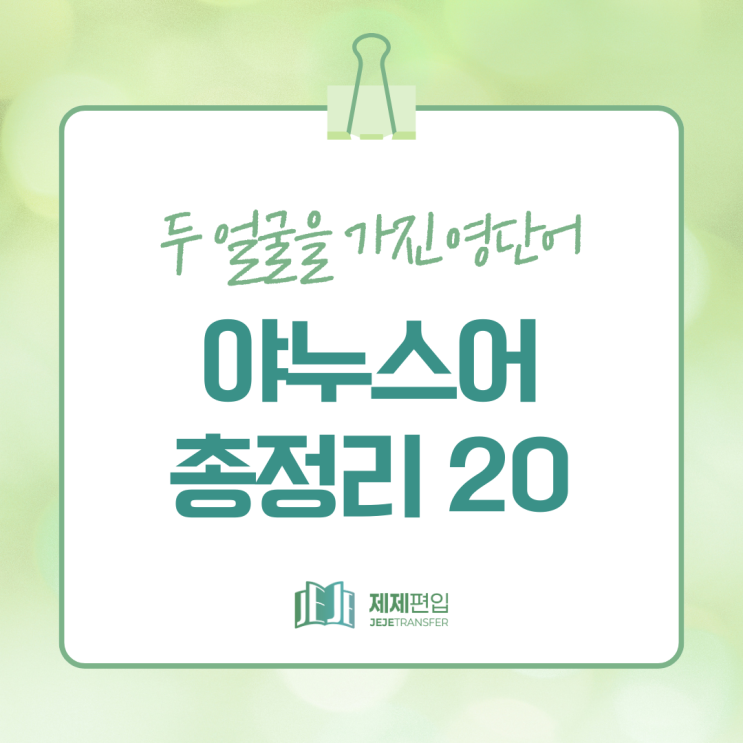 안녕하세요, 제제편입입니다:) 2월, 기초 단어장을 펴고 열심히 외우고 계실 텐데요. 혹시 이런 경험 없으신가요? 분명 "Sanction은 승인하다"라고 외웠는데, 문장을 보니 "러시아를 제재(Sanction)하다"라고 해석되는 마법 같은 상황 말이죠. "내 기억력이 문제일까, 단어장이 문제일까?" 고민하셨다면 정답은 둘 다 아닙니다. 여러분은 '야누스어'를 만난 것뿐입니다. 여러분의 시행착오를 줄여드리기 위해 편입 영어 문제 풀이시 자주 보이는 '야누스어'를 정리해서 공유해요. 편입 야누스어 다운로드 (PDF) 편영 핵심 야누스어 20개를 엄선했습니다. **이 자료는 본격적인 학원 개강과 학....... <img src="https://blogthumb.pstatic.net/MjAyNjAyMDVfMTI5/MDAxNzcwMjY2ODY0Nzcy.ReJVCZtumF4BSgq6cC08MjmgTC1IxAL9jpQ31AKgls0g.gtkMqfmV43-WFLjKxC2Ov3Fd4KgcOMky95qGN72YsdAg.PNG/26_%C1%A6%C1%A6%C6%ED%C0%D4_%C0%CF%C1%A4%2811%BF%F9%29.png?type=s3" />