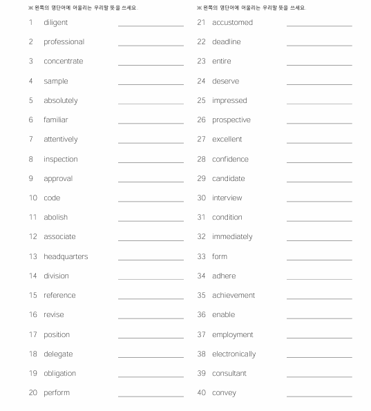 해커스보카 Day1-3복습(표제어)(해커스노랑이) 아래 파일은 2페이지인데, 첫페이지는 문제, 두번째 페이지는 정답입니다. 주의하셔서 살펴 보시기 바랍니다. 단어는 누적식으로 반복학습하는게 좋은데, 누적구간은 본인의 공부량 그리고 스타일에 따라 정하셔도 됩니다. 일단, 처음 단어 공부를 한다고 가정하고 3일차 까지를 누적으로 문제를 가져왔습니다. 참고로 120개 단어중에 40개만 테스트 하는것이기 때문에 완벽한 리뷰는 아닙니다. 하지만, 120개를 전부다 테스트하는것 보단 이런방법도 괜찮습니다. 대신 계속 반복해 주시면 좋겠습니다. 학생중에선 극단적인 누적반복학습을 하는 경우도 있습니다. 예시로는 1일: 1일차 2일: 1,2일차....... <img src="https://blogthumb.pstatic.net/MjAyNjAyMThfMSAg/MDAxNzcxMzg2ODk1Nzc1.2937j27rh7tQPeipy5dUC-mKxeB80TbmvaShHs5mmEEg.VfpwQwYSiJ2YcVX8l6p1P-M40SwyvGBS4YzxbLTTERgg.PNG/image.png?type=s3" />