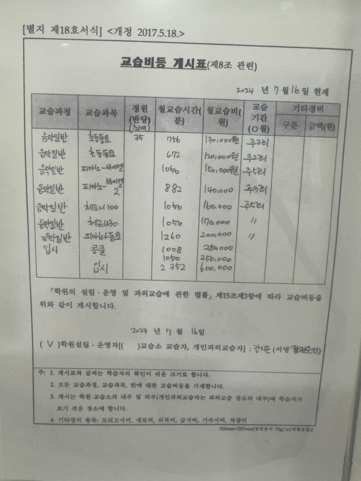 교습비 등 게시표