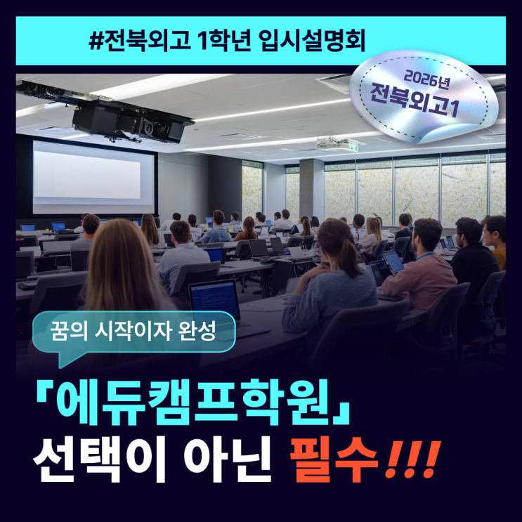 #에듀캠프학원 #전북외고 #입시설명회 #전북외고내신 #전북외고학습관리 #전북외고입시 #전북외고학교생활 #전주영어수학전문 #전주영수전문학원 영어도 수학도 역시 에듀캠프 새학기, 방향이 성적을 만듭니다. 오늘 에듀캠프학원에서 전북외고 1학년 학생들을 대상으로 입시설명회를 진행했습니다. 바쁜 일정 속에서도 적극적으로 참여해준 우리 학생들, 진심으로 고맙습니다. 이번 설명회는 단순한 입시 정보 전달이 아니라 외고에 맞는 ‘생활 설계 전략’을 함께 고민하는 시간이었습니다. ♣ 이번 설명회 핵심 내용 ♣ 1️⃣ 새학기 생활관리 전략 외고는 ‘수업만 듣는 학교’가 아닙니다. 과제, 수행평가, 독서, 비교과 활동까지 모든 것....... <img src="https://blogthumb.pstatic.net/MjAyNjAyMjhfMzAw/MDAxNzcyMjYzNTAyMTY2.HB2g9WXyOHixpnnigle9UdVhLPBOUaICr1L3zfF5TLQg.E23c_AHRcc5_-U2LwOObxauWG4ZHf9brFXsdra5TCc4g.PNG/%C1%A6%B8%F1%C0%BB_%C0%D4%B7%C2%C7%D8%C1%D6%BC%BC%BF%E4._%2891%29.png?type=s3" />