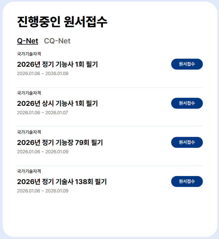 2026년 기능사 시험일정 먼저 확인해볼까요 ? 기능사 필기시험은 학습 준비만큼이나 원서접수 과정이 매우 중요합니다. 특히 처음 시험을 준비하는 학생들의 경우 “어디서 접수해야 하는지”, “사전입력은 꼭 해야 하는지”, “사진은 어떤 걸 써야 하는지” 등 접수 과정에서 많은 혼란을 겪게 됩니다. 이 글은 기능사 필기 원서접수를 처음 진행하는 학생과 학부모님을 위해 사전입력부터 접수 완료까지의 과정을 한 번에 확인하실 수 있도록 정리한 안내 글입니다. 기능사 필기 원서접수는 어디서 하나요? 기능사 필기시험 원서접수는 큐넷(Q-Net.OR.KR) 사이트에서 진행됩니다. 회원가입, 사진등록을 미리 해 주세요. (사전입력시 처음 접....... <img src="https://blogthumb.pstatic.net/MjAyNjAxMDFfMTcy/MDAxNzY3Mjc0NTA0MzYz.Q8VjaRre8iazZx-hNob0pdH0yeI_bojJYjh-kHexahgg.9in-VgENPzZGH247Six-ZUHYC5uDMoMrkK6NDm9Un-Eg.PNG/image.png?type=s3" />