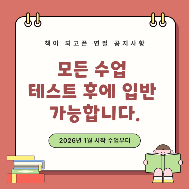 자녀에게 꼭 맞는 수업을 추천해드리기 위해 입반시 독서진단이 먼저 진행되어야 합니다. 독서진단: 매주 목,금 2시~6시 운영 약 30분 소요. 무료 읽기 독립이 가능한 초1부터 고등 생기부를 준비하는 중3까지 독서코칭: 대기 없이 매주 둘째주 목요일 공지 후 선착순 등록 논술토론,인문영재: 독서 진단 후 요일 시간 결정 후 등록 or 대기 <img src="https://blogthumb.pstatic.net/MjAyNTExMTdfMjQ0/MDAxNzYzMzUzMzQ2MDM5.T9i00Xa0UuF--LCFfy5xyavu8AoNlC06G8lWfgbMR8Ig.cy_lkX0XN160DMQJepvsioNAjwbShz0cmyls4Xz8vQ0g.PNG/900%A3%DF1763353032444.png?type=s3" />