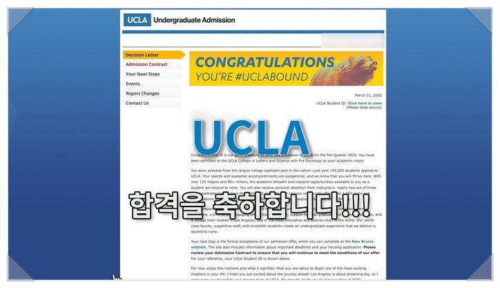UC 합격을 결정하는 7Pages의 비밀! UCLA, UCSD, UC Davis, UC Irvine, UCSB 까지 실제 합격생의 원서로 배우는 Activities (7 Pages) + Essay (2 Pages) 마스터클래스 입학사정관이 평가하는 UC Application은 총 14~17페이지로 이루어져 있습니다.아래는 실제 UCLA 합격생의 원서 구성입니다. 1. About You (p.1~3) 2. Campus & Majors (p.3~4) 3. Academic History (p.4~7) 4. Test Scores (p.7~8) ⭐ 5. Activities & Awards (p.8~14) 6. Scholarships & Support Programs (p.15) ⭐ 7. Personal Insight Questions (Essay) (p.15~16) 8. Additional Comments (p.16) 9. Sign & Release (p.17) 이 중에서 UC 합격....... <img src="https://blogthumb.pstatic.net/MjAyNTExMjVfMjAy/MDAxNzY0MDgwNDM0MTA0.rkRHtgvLwd1YI77n0R1rkkYK5lDDs0RI2dynAUOY66Mg.24DmHJeCm6-PyEt_HLaiCrJFsnCkHDp09Win36Ifbk8g.JPEG/UCLA_%C7%D5%B0%DD_%C6%ED%C1%F6_2025.jpg?type=s3" />