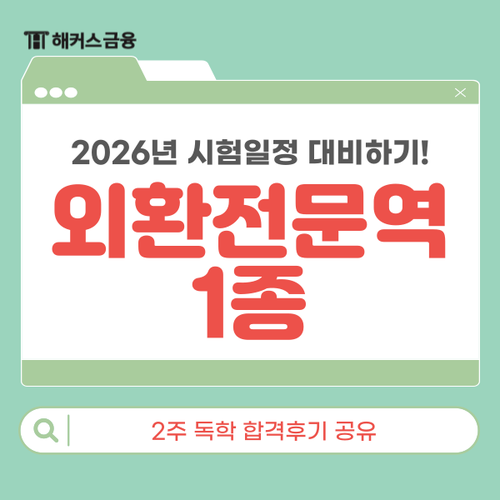 2026년 외환전문역1종 시험을 준비할 분들이라면? 오늘의 글을 집중해서 읽어주세요! 일 년에 딱 세 번뿐인 시험이기에 언제쯤 시험이 시행될지 미리 파악해두고 빠르게 공부 계획을 철저히 세우고 체계적으로 학습하는 것이 중요할 텐데요! 따라서 오늘은 2026 외환전문역1종 시험일정은 언제일지 함께 예상해 보고, 2주라는 단기간에 합격한 합격생의 공부 후기와 독학 방법을 살펴볼게요:) 2026년 외환전문역 1종 시험일정 2026 외환전문역1종 일정은 아직 미발표 상태이지만, 지난 22년~25년도 시험일정을 확인해 보면 연간 3회의 시험이 3월, 7월, 11월에 시행되는 규칙적인 패턴이 보입니다. 따라서 2026년에도 비슷한 시기에 시행될 가능....... <img src="https://blogthumb.pstatic.net/MjAyNTEyMDhfMTc4/MDAxNzY1MTU2MDUwMjI0.YDz3uqs6z2ROxWMWKjvMKyYfHeG1z9Ep9IY8agzcG5Yg.1v6O_yXgcqlM1bMI5Ld6nyqT7mF76x9MtEOUqNb-ojQg.PNG/001.png?type=s3" />