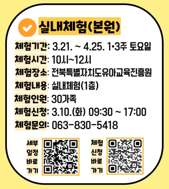 전주과학학원 킴스과학학원 과학 전문학원 안녕하세요. 킴스과학학원입니다. 오늘은 전북특별자치도교육청유아교육진흥원에서 진행하는 토요가족 프로그램을 발견하여 알려드리려고 합니다. 2026년 지역사회와 함께 하는 토요가족체험(1기) 신청 대상 3-5세 (2020.01.01.부터 2023.02.28.) 유아 및 가족 신청 방법 전북특별자치도교육청 유아교육 진흥원 온라인 접수, 우선 신청 순 *정원 마감 시 대기 등록 가능(순번 별 개별 안내), 기수별 1회 신청 가능 유의 사항 3세 미만 영아, 6세 이상 아동(초등학교 2학년까지)은 동반 입장 가능하나, 안전상 일부 체험은 제한됩니다. 유아의 안전한 체험을 위해 보호자 1인당 유아 1명 동....... <img src="https://blogthumb.pstatic.net/MjAyNjAzMTBfMjkz/MDAxNzczMTM4ODM5NTg1.HzpT0rC8RilzehxbPiWtIwukeaHztJQu9OhAMx6xOAEg.i5g7obfKGWRHA96hzc4Q0sKWe9P5Ci3YROLktpsiZl0g.PNG/image.png?type=s3" />