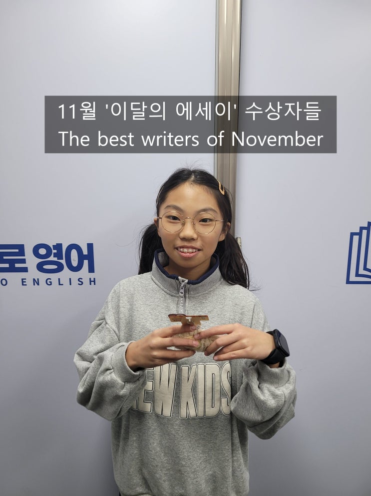 안녕하세요, 파로영어입니다. 에세이 풀세트 학습을 하는 친구들은 교재가 끝날 때마다 '파이널테스트'를 치룹니다! 파이널테스트 중 Free Essay 부문에서 잘 한 친구들을 각 반 별로 선발하여 매 달 수상하고 있습니다 The best writer of November E1-5)연은초 3 정0우 (Justin) E1-2)응암초 3 김0윤(Ruby) E1-2)연은초 4 김0효(Hailey) E2-2)연은초 4 최0준(Kevin) E1-1)응암초 4 김0훈(Teddy) E1-1)연은초 5 김0오(Teo) E1-6)연은초 5 조0준(Max) E3-1)연은초 5 이0민(Alice) E3-5)연은초 5 방0솔(Lisa) E2-4)응암초 5 이0인(Iris) E1-5)연은초 3 정0우 (Justin) E1-2)응암초 3 김0윤(Ruby) E1-2)연은초 4 김0효(Hailey) E2-2....... <img src="https://blogthumb.pstatic.net/MjAyNTEyMDhfMTU1/MDAxNzY1MTczODY5NjMz.jOLjlVUkp2z5W17Bkk536WHQazJn_mcHLP9HyfdIujQg.rHvId6DOELQ47KfFDRn4vh79ohp4yxrY0Z8OfJkz3dsg.JPEG/KakaoTalk_20251208_150300282.jpg?type=s3" />