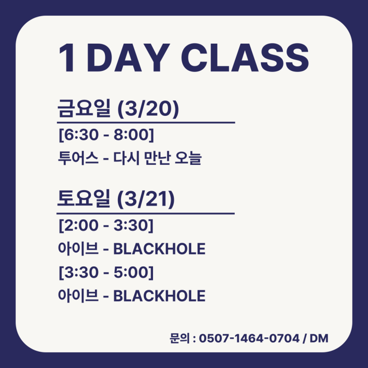 ️ 3월 셋째 주 원데이 수업 안내 안녕하세요, 아지트 뮤직댄스 학원 봉선점입니다 :) 3월을 맞이하여 학원 수업 일정 안내드립니다. 3월 셋째 주에는 특별 원데이 수업이 진행됩니다! 하루 동안 부담 없이 참여하실 수 있는 원데이 클래스로, 새로운 에너지로 한 달을 보내고 싶은 분들께 추천드려요 ✨ 또한, 3월 셋째 주 정규 수업은 모두 정상적으로 진행되오니 기존 수강생분들께서는 평소와 동일하게 수업 참여해 주시면 됩니다. 바쁜 일상 속에서도 항상 저희 학원에 관심 가져주시고 찾아주셔서 진심으로 감사드립니다. 원데이 수업을 통해 새로운 에너지를 채우고, 정규 수업에서는 더욱 즐겁고 집중도 높은 시간으로 함께해요....... <img src="https://blogthumb.pstatic.net/MjAyNjAzMTdfMjMw/MDAxNzczNzM3OTQxODE4.jsOES2GpcVb6ovLavzfyeUS4kNJ8Zvd1xKxBPyigg_Ug.ZrSnaJcxCJus4_4oomBzWu0cVPWTqoto9Xnk-a2vvbAg.PNG/001.png?type=s3" />