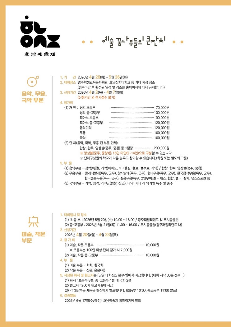 전통의 호남예술제! 2026년도 4월부터 열리는 제71회 호남예술제의 대회요강이 드디어 업로드 되었습니다! 대회요강 빠르게 가지고 왔어요! 음악부문은 4월 28일부터 시작되어 5월 26일에 마무리되는데요~ 이중에서도 피아노는 5월 10일 일요일 - 중등부, 초등1,2학년부 5월 17일 일요일 - 고등부, 초등5,6학년부 5월 24일 일요일 - 초등3,4학년부 이렇게 나뉘어 열립니다! 장소는 모두 호남신학대학교에요! 접수기간은 4월 2일 목요일부터 4월 7일 화요일까지이며, 신청기간이 지나면 추가접수가 절대불가하기 때문에 신청기간 놓치지 않도록 꼭!! 기억+메모해 두세요!! 지정곡은 이미 알고계시겠지만, 다시 한 번 체크할 수 있도....... <img src="https://blogthumb.pstatic.net/MjAyNjAzMThfMjY5/MDAxNzczODA1ODgzOTk4.zV5ldIlDLdqLlZYKchV0XNjj2DrvgtmYjlHAAntVLHEg.RwbNQwGAzTJ42SiFnueMzPA5aisfIWhAFbxHJiiRnUMg.JPEG/71%C8%B8_%C8%A3%B3%B2%BF%B9%BC%FA%C1%A6_%B4%EB%C8%B8%BF%E4%B0%AD.jpg?type=s3" />