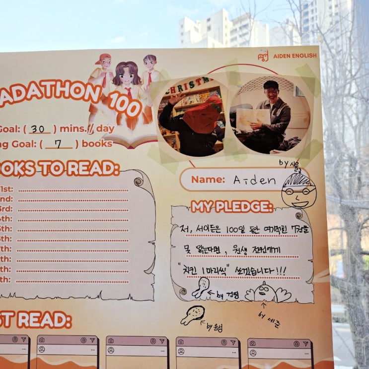 READATHON 100 에이든쌤의 다짐 : 저, 서이든은 100일동안 여기적힌 7권을 다 못 읽을시, 원생 전원에게 "치킨 1 마리씩" 쏘겠습니다!!! #readathon #에이든영어학원 #마포초등영어 #다청다독스토리텔링 #다청다독에이든영어 <img src="https://blogthumb.pstatic.net/MjAyNTEyMDVfMTcz/MDAxNzY0ODk0NjY0MDAx.5vPe-0XjyfOg5pxLu4TN_4XTqu_RxCQlfcn5vdsrWxsg.A5XRhvpz-xeU6H7SzRclf_d_13fZHCE-XiYGqAiZ-1cg.JPEG/900%A3%DF1764894562474.jpg?type=s3" />