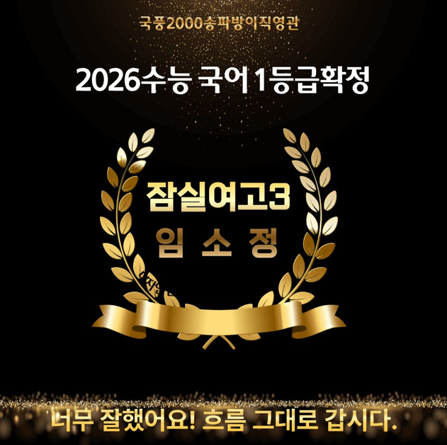 국풍2000 송파방이직영관이 만든 국어 고정 1등급의 힘 수능점수가 나오기 시작했습니다 이른아침받은전화 선생님 저 국어1등급입니다 너무잘했다 그럴줄알았지~~~~ 엄청축하해 해마다 받는 전화입니다 올해는 어려웠다하여 더더욱 감동입니다 그러면서 보람을 느끼고 그러면서 행복합니다 오늘 블로그 포스팅주제는 "행복"입니다 2026학년도 수능 국어에서 **97점(1등급)**이라는 값진 성적을 거둔 학생이 나왔습니다. 이번 성과는 단순히 ‘운이 좋았다’가 아니라, 1년 내내 흔들리지 않는 태도와 정확한 공부 방향이 만들어낸 결과였습니다. 국어는 누구에게나 어려운 과목입니다. 특히 2026학년도는 EBS 연계 축소·지문 난도 유지....... <img src="https://blogthumb.pstatic.net/MjAyNTEyMDVfNTcg/MDAxNzY0OTE3MzAyNzk3.nhHJahCUVJg7zy6Eeqgyt85uWJL0qEnYFMrinnxwCwUg.O1dslXyhZm2sQOk4rhONeUQQkhAER9hmuCQNdlEfa2gg.PNG/image.png?type=s3" />