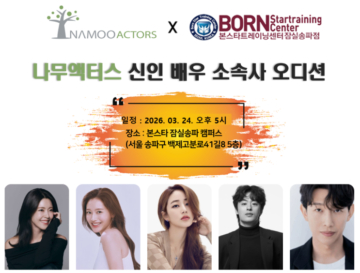 ✨ 본스타잠실 X 나무액터스 ✨ 본원에서 나무액터스 내방 오디션이 진행됩니다. 많은 관심과 참여 부탁드립니다 일정 | 2026.03.24 오후 5시 장소 | 본스타 잠실송파캠퍼스 대상 | 연기 ✨ 배우&가수 정규 class 안내 입시반 | 오디션반 | 전문반 취미반 | 단기속성반 | 앨범제작반 ✨본스타가 배출해낸 대표 스타들! 배우 이도현 배우 고민시 배우 최현욱 카리나 (aespa) 하니 (NewJeans) 에이나 (하츠투하츠) 솔라 (마마무) 소진 (걸스데이) 영지 (KARA) 소하 (Say My Name) 진솔 (이달의 소녀) 김나영 (구구단) 남우현 (인피니트) [본원 수강 및 상담 문의] ☎ 전화문의 02-6215-9000 카카오톡 상담 ID: spbornstar 공식 홈....... <img src="https://blogthumb.pstatic.net/MjAyNjAzMTdfMjU0/MDAxNzczNzI1NjEwMzMz.LEd6KhFfe9yZFaaRTZf6x7KUJZUh_1xT3zmRjtfaUhsg.4DkBmzAbA6G6PLkbpTpznaMjvXlw4tG5m4kqo8neQMYg.PNG/KakaoTalk_20260317_142914631.png?type=s3" />