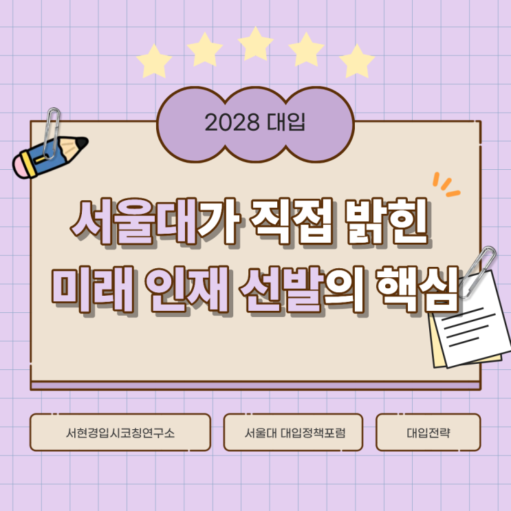 안녕하세요, 서현경 입시코칭연구소입니다. 지난 2026년 1월, 서울대학교에서 향후 대입의 향방을 가르는 중요한 정책 포럼이 열렸습니다. 이번 포럼의 핵심은 "학생이 고교 생활 동안 쌓은 경험을 대입 전형에서 어떻게 역량으로 증명할 것인가"에 있습니다. 단순히 성적표에 찍힌 숫자만으로는 설명할 수 없는, 서울대만의 인재 선발 기준을 3가지 핵심 테마로 나누어 심층 분석해 드립니다. 1. 면접의 대전환: 'SNU 역량평가 면접'의 도입 기존의 면접이 서류의 진위 여부를 확인하거나 교과 지식을 묻는 수준이었다면, 앞으로의 서울대 면접은 '과정 중심 평가'로 완전히 탈바꿈합니다. - 학생부 기반 역량평....... <img src="https://blogthumb.pstatic.net/MjAyNjAzMTdfMzUg/MDAxNzczNzMwMzM4OTM3.Hi29TYLLH0RysP6SR6PmNj_vfabphyuySeiVKN-b6gIg.W7y7ejcD_gmjAhIwpNdABmbVvS90XzcNy6AicY0nGnAg.PNG/%C1%A6%B8%F1%C0%BB_%C0%D4%B7%C2%C7%D8%C1%D6%BC%BC%BF%E4._%285%29.png?type=s3" />