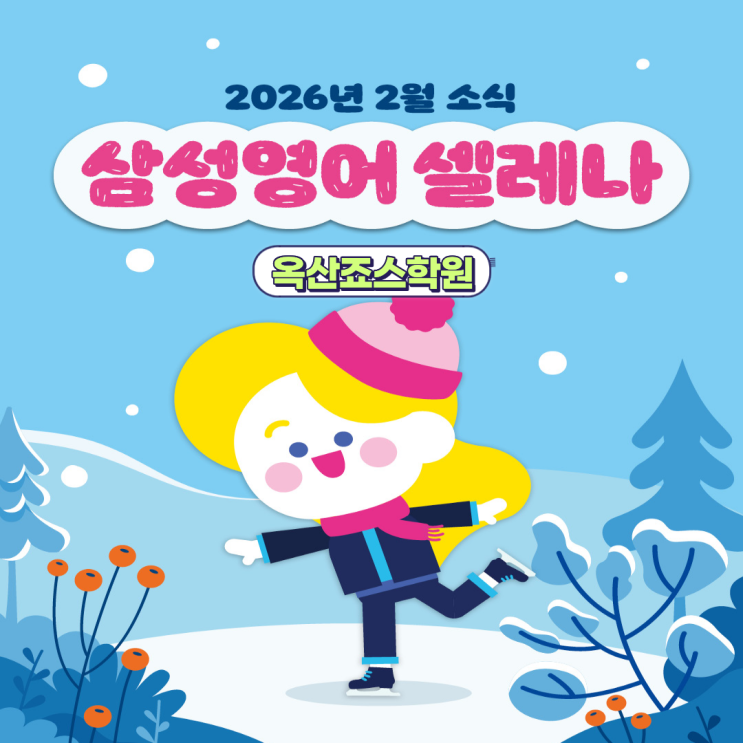 겨울방학이 마무리되고 새 학년을 준비하는 2월, 중간에 긴 설날연휴가 있어서 더욱 기대되는 달 입니다. 긴 휴강에도 아이들의 학습 흐름을 끊지 않으면서도 늘 꾸준히 성장하는 모습과 학습태도를 잃지 않도록 삼성영어 셀레나 옥산죠스학원은 2월 한 달도 알차게 운영합니다. 2월 학원 일정 안내 ✔ 2월 수업일 : 1월 29일 (목) ~ 3월 3일 (수) : 20차시 ✔ 휴강일 : 2월 16일 (월) ~ 2월 18일 (수) / 3월 2일(월) 대체공휴일 ✔ 3월 등록일 : 2월 24일(화) ~3월 6일 (금) 설날연휴는 수업일 포함 되지 않습니다. 20차시 결손 없이 진도를 이어갑니다. 금요 스페셜 수업 방학 중 금요일 수업일은 셀레나 온라인(말하기) / 링고핏 (리딩, 라이....... <img src="https://blogthumb.pstatic.net/MjAyNjAyMDRfMjk1/MDAxNzcwMTg5NjgxNzEz.YRqoBxB7UuC_cN3UCoYLApszaJTFq6JOWP70RPi--dYg.FtrpKsUXEjrHp9qSUzQc5Lxqte0C_nkpKgWXZRjT_Mwg.PNG/1.png?type=s3" />