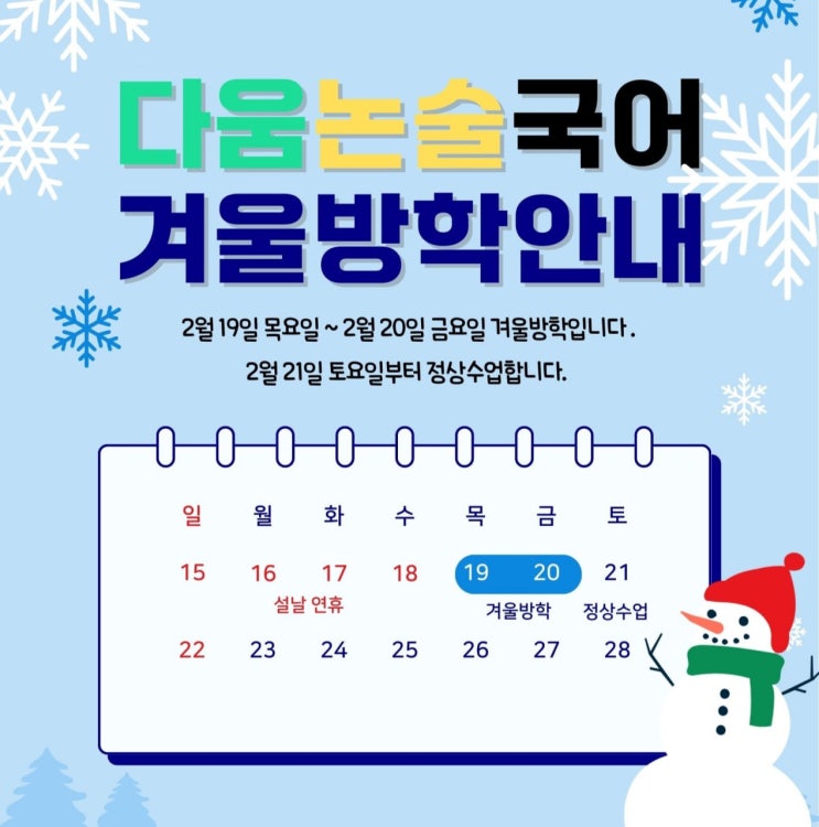2026년 2월 다움논술국어교습소 겨울방학공지