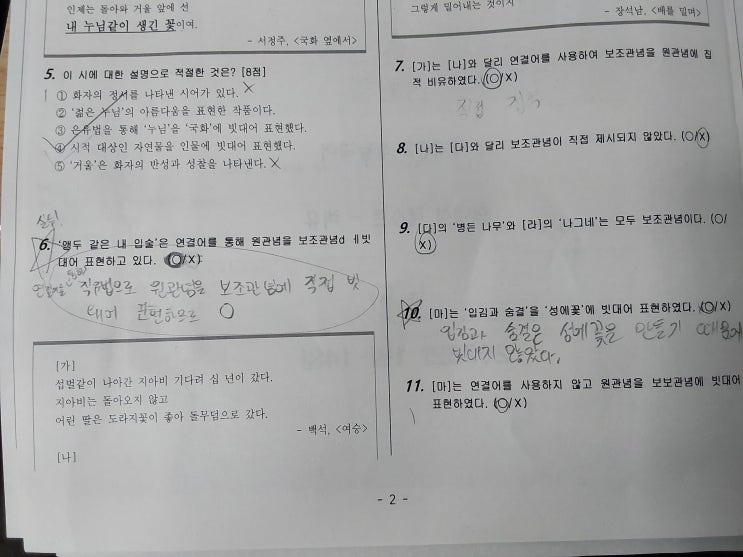 [늘푸른다온학원_국어 전문_제천 국어학원] 예비중2 현대시 테스트_오답노트 작성 확인