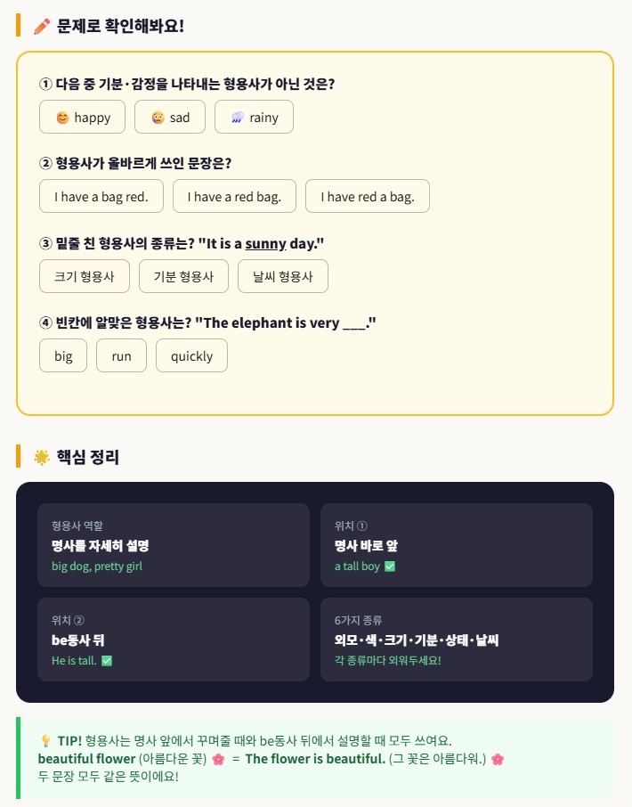 영어는 꾸며주는들이 정말 많아요~! 이름들을 꾸며주는 품사 형용사를 만나 봅시다! 위치 강조! 명사 앞이나 Be 동사 뒤 뜻 : ~한/ ~하게 하는/ #남악초 #오룡초 #행복초 #사랑초 #부주초 #영산초 초등학생 눈과 귀로 머리로 이해되게 나를 낮춰 봅니다. :) 오늘도 따사로운 봄내음 맘껏 맡는 하루 되셔요! <img src="https://blogthumb.pstatic.net/MjAyNjA0MDJfMjky/MDAxNzc1MTE0MTU5NjAy.TbQpD8Pi3IDiwkn0oWKKiorOVVv_iiFLikToSlYYmK0g.fmk5gdYppwlvPQ1WnPwDWIhLs0Lw8JCFa4kFuyC67w0g.JPEG/4.jpg?type=s3" />