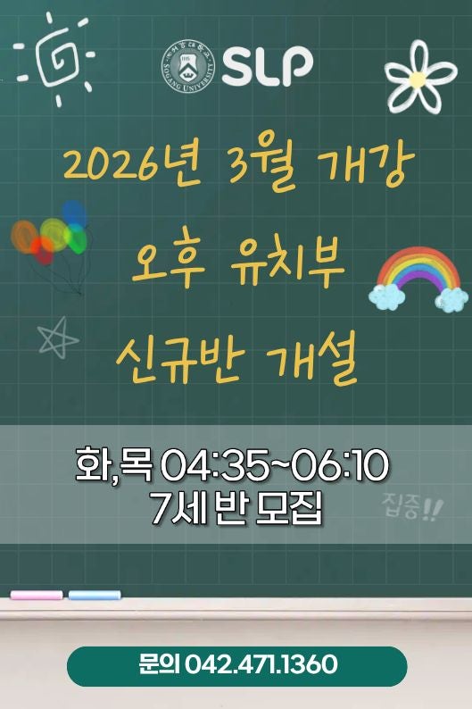 오후 영어유치부 전용 커리큘럼으로 수업하는지 꼼꼼히 비교하세요! 서강SLP 오후 유치부 전용 커리큘럼 "Apple Juice" 의 목표 SLP 오후 영어유치부로 시작해 초등 연계까지! 01. Listening- 자주 쓰는 짧은 문장, 간단한 질문을 이해할 수 있습니다. 간단한 문장을 듣고 관련 문제를 풀 수 있습니다. 02. Speaking- 개인적인 정보에 대해 단문을 이용해서 대답합니다. 03. Reading- 학습한 단어를 통문장으로 읽어나갈 수 있으며, 이해가 가능합니다. 04. Writing- 간단한 자기소개를 문장으로 쓸 수 있으며, 익숙한 주제에 관련된 단어들을 쓸 수 있습니다.수업 시간: 화,목 시간: 04:35~06:10 모집 연령: 7세 문의전화: 042.471.13....... <img src="https://blogthumb.pstatic.net/MjAyNjAxMDZfNDQg/MDAxNzY3Njc3MjM2NjE2.N3bY25jpIf102jzJbGvUVlwqVcnkt2wuEltLD65WEtYg.CZVARcc-n4OHetqVTgms5Ypvwx4DaQd1Bh05qwV2kM4g.JPEG/26%B3%E2_%BF%C0%C8%C4%C0%AF%C4%A1%BA%CE.jpg?type=s3" />