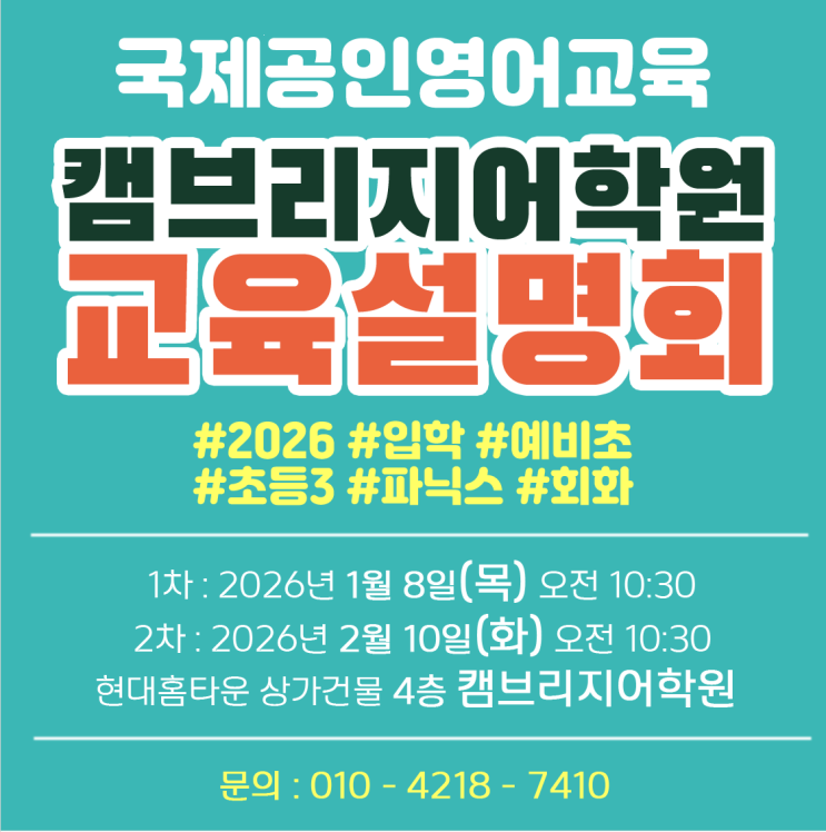 며칠 전, 2026년 신학기 신규반 교육 설명회가 진행되었습니다. 평일임에도 불구하고 많은 학부모님들께서 참석해 주셔서, 현재 영어 교육에 대한 관심과 고민이 얼마나 깊은지 다시 한번 느낄 수 있는 시간이었습니다. 이번 설명회의 중심 주제는 역시 국제표준영어교육이었습니다. 단순히 영어를 “잘하는 것”이 아니라, 왜 영어를 배우는지 우리 아이에게 맞는 목적은 무엇인지 그 목적을 어떻게 학습으로 연결해야 하는지 에 대해 함께 생각해 보는 시간이었습니다. 현재 교육 환경과 학교 내신의 흐름을 짚어보며, 의사소통 능력의 중요성도 함께 이야기 나누었습니다. 이번 설명회에서는 티파니 원장님의 수업 시연도 함께....... <img src="https://blogthumb.pstatic.net/MjAyNjAxMTNfMTMx/MDAxNzY4MjkxNjI5OTE3.i9mzzLGpeuAx5rAMeh_2LwZTQgDyiuAId0jo1-p0zSUg.nYBBfcCURw7uysJfD1Gq1QqyjJV1ChOqHsFxHlqlFDcg.PNG/KakaoTalk_Photo_2025-12-22-15-13-37.png?type=s3" />