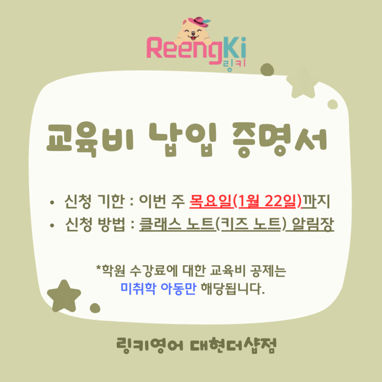 울산 남구 학부모 필독|2025 교육비 세액공제 기준, 미취학 아동 학원비·예비초 공제 정리 2025년 교육비 납입 증명서 신청 안내 안녕하세요, 학부모님. 2025년 연말정산 교육비 세액공제를 준비하시는 학부모님들을 위해 교육비 납입 증명서 신청 방법과 공제 관련 기본 사항을 안내드립니다. 기한 내 신청하셔서 절세 혜택을 놓치지 않으시길 바랍니다. 교육비 납입 증명서 신청 안내 신청 기한 2025년 1월 22일(목)까지 신청 방법 클래스노트(키즈노트) 알림장을 통해 신청 발급 일정 2025년 1월 26일(월) ~ 1월 27일(화) 신청하신 학부모님께 일괄 전달드립니다. 공제 대상 안내 미취학 아동 학원비에 한해 교육비 세액....... <img src="https://blogthumb.pstatic.net/MjAyNjAxMTlfMTQg/MDAxNzY4ODIzNDcyMTMy.GvcsdHw4u3t363qpG_xjlDLgYwZ-W_q1m7M8P3rPKfsg.yvdjr-ul2686Gpjjawgx72l_QTr-W35TDThDuNwaKxMg.PNG/%C6%C4%B6%F5%BB%F6_%B4%DC%BC%F8%C7%D1_%C0%CF%B7%AF%BD%BA%C6%AE_%B0%F8%BA%CE_%C0%CE%BD%BA%C5%B8%B1%D7%B7%A5_%B0%D4%BD%C3%B9%B0.png?type=s3" />